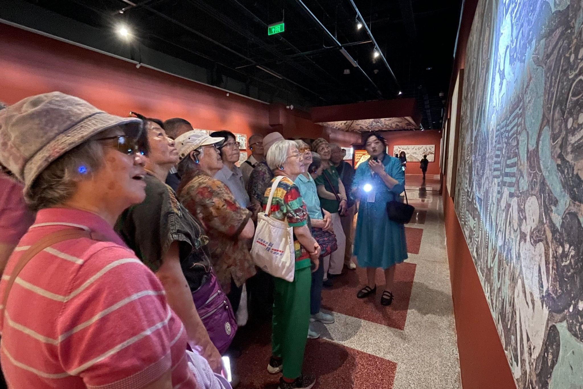 展览现场,透过高精度复刻的壁画与彩塑,老党员们感受了敦煌艺术跨越千年的美学魅力,纷纷感慨,这些艺术珍品不仅是中华文明的瑰宝,更凝结着古代工匠精益求精的精神。通过讲解,从壁画中的供养人形象到"敦煌守护神"常书鸿等先辈的坚守故事,将艺术鉴赏与历史叙事相结合,老党员们在沉浸式体验中理解了敦煌文化的精神内核。敦煌人在荒漠中守护文明的执着,和老师们当年扎根讲台的信念是相通的。