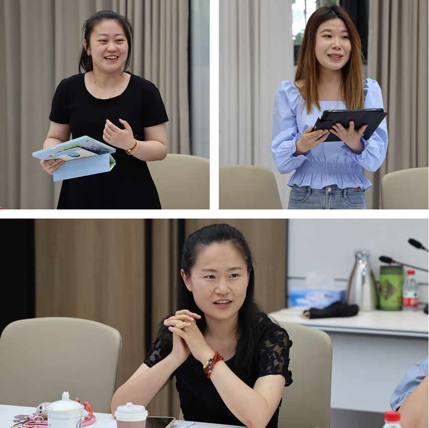 实习学生秦滢、魏欣然分享实习心得,实习生导师音乐教研组贺晓宇老师点评实习成果