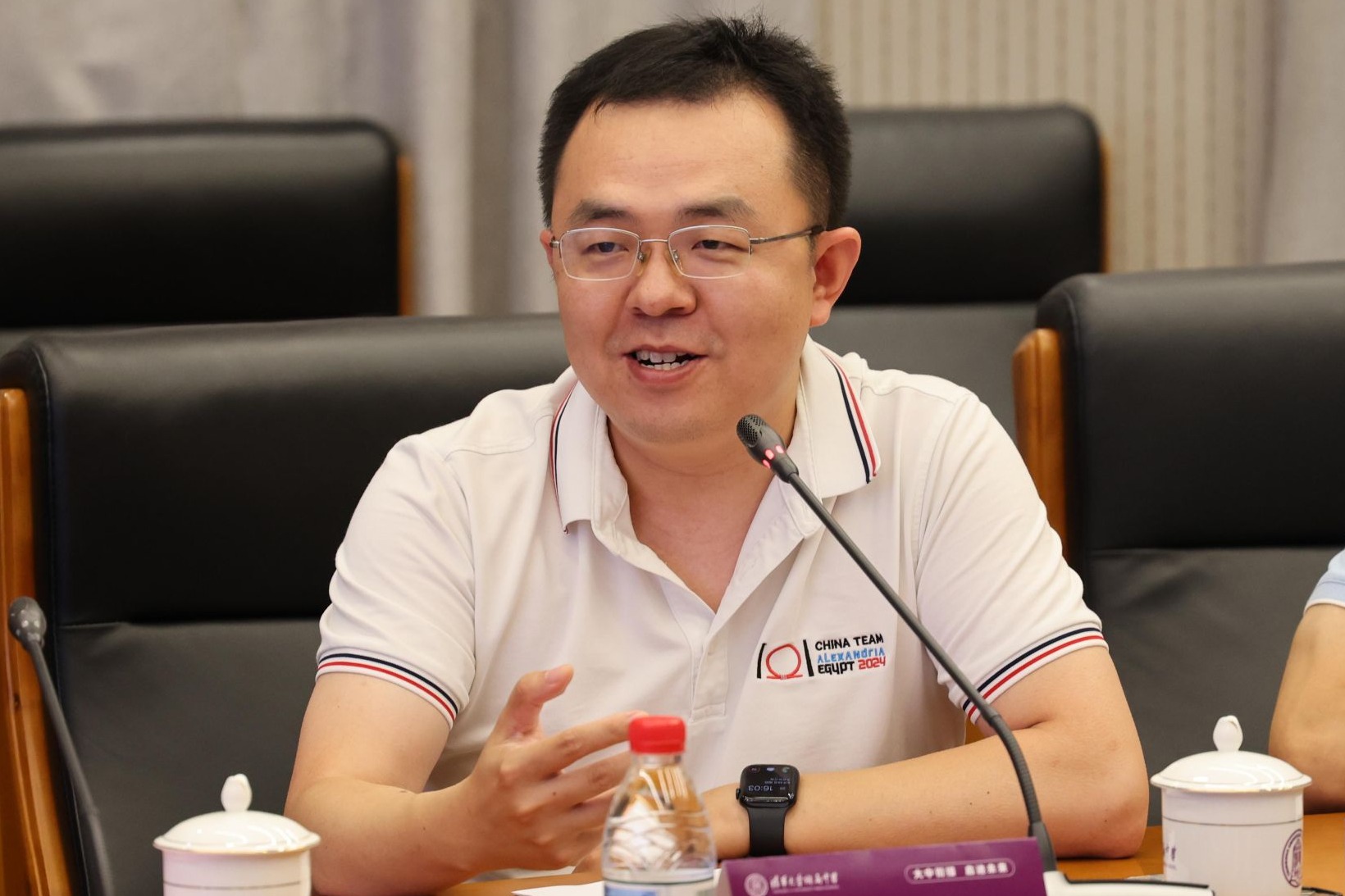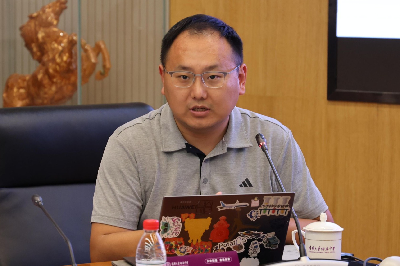 随后,科技办公室谭洪政主任汇报了人工智能试验班的课程情况。通过国家必修课程、自主选修课程和人工智能特色课程群构建了阶梯式的拔尖创新人才培养框架。其中,特色课程群聚焦数学思维、科学素养、跨学科实践和人文伦理四大维度,采用“大中衔接”模式,利用3:30课后时间开展工作坊和项目式学习,实现从理论到实践的能力提升。