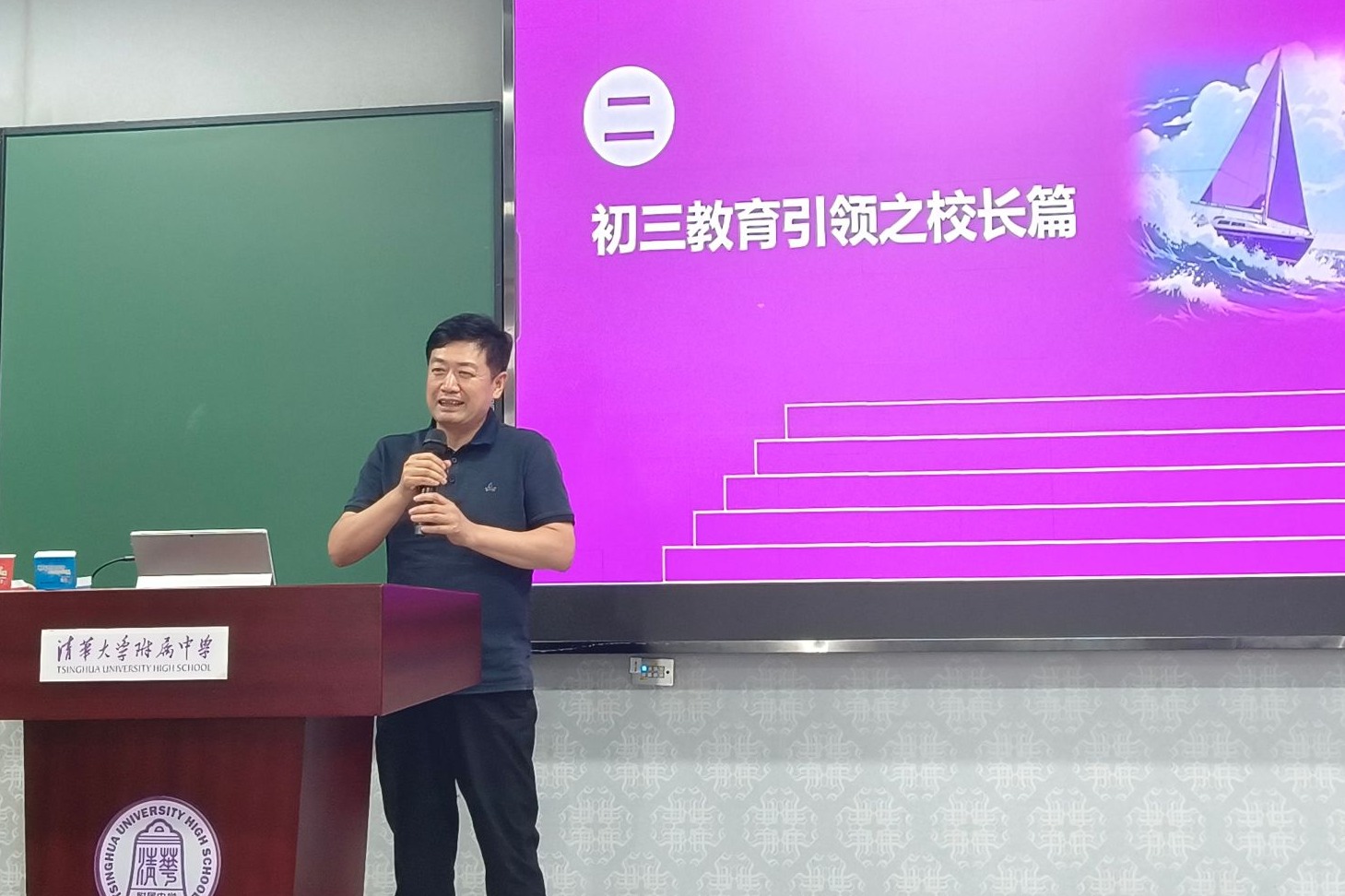 张彪主任以“做‘躬身入局’者”为主题,对初三教学进行具体指导。“躬身入局”,核心内涵即主动参与和实践精神。张彪主任提醒老师们要突破旁观者心态,强调实践行动,共担责任与风险,坚持不忘本来、吸收外来、面向未来。最后,张彪主任以“相信那些你以为无人问津的候场岁月,终会在某一刻化为登台的底气”鼓励全体老师,任重道远,博学笃行。
