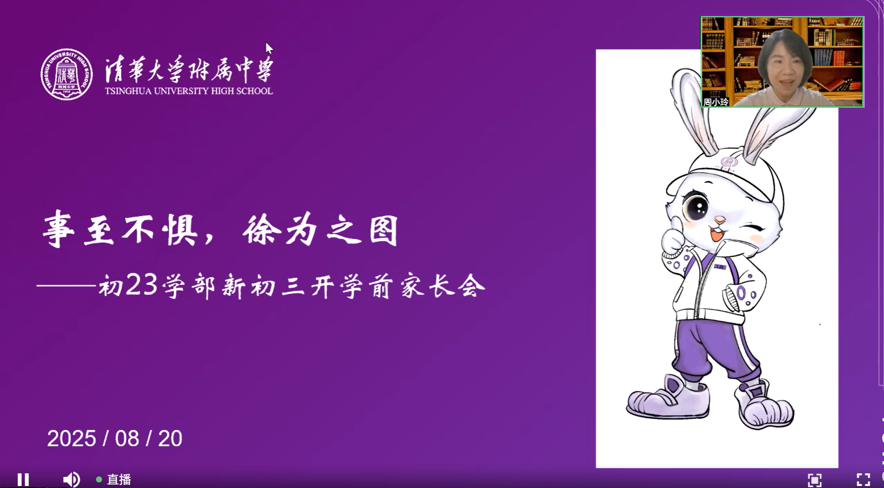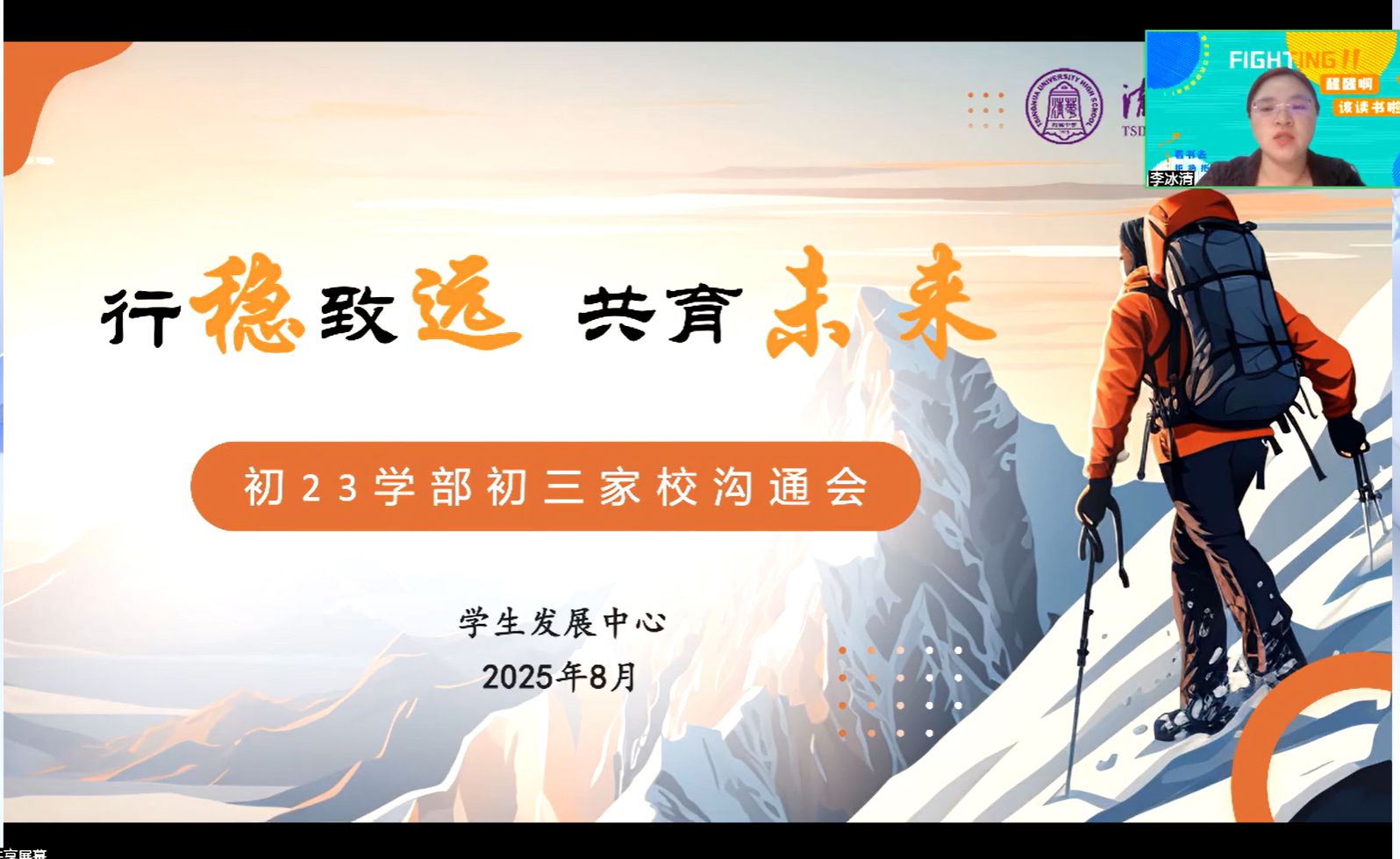 皇冠体育官网初23学部副主任周小玲老师以“事至不惧,徐为之图”为主题,从学部层面为家长介绍初三工作的整体节奏、开学初期的重点安排,以及如何帮助孩子从假期状态高效切换到初三节奏。周小玲老师首先说到,面对初三的到来和各种变化,家长和孩子们都不要慌乱,把心静下来,才能更好地应对和表现。她同时说明了初三之后学校和学部的整体规划,也提出对于学生和家长的各项要求与期待。学生要及早收心、学习用心、但求尽心,也要保持健康和阅读;家长要调整姿态、协助培养、关注孩子、形成家校合力。最后,借用曾国藩“结硬寨,打呆仗”的战略思想,希望家长和学生都可以戒骄戒躁,沉着冷静地面对初三。