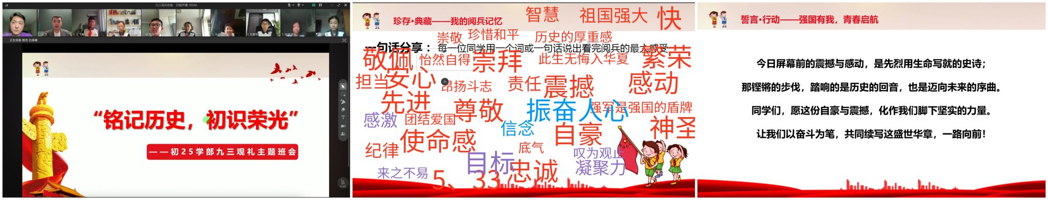 在随后的线上讨论阶段,各班同学在班主任的引导下,展开热烈讨论。在“荣耀时刻”环节中,同学们观看往年阅兵的视频,直观地感受到阅兵的震撼;在“珍存·典藏”环节中,同学们踊跃展示观礼单成果,分享感受;在“砺剑·传承”环节中,同学们通过对比本次阅兵与1949年阅兵,深入探讨人民军队变与不变的内涵;在“格局·使命”环节中,师生共同回顾抗战历史,领悟阅兵意义;在最后的“誓言·行动”环节中,同学们则着眼于当下,立志成为心怀家国、勇担重任的时代新人。