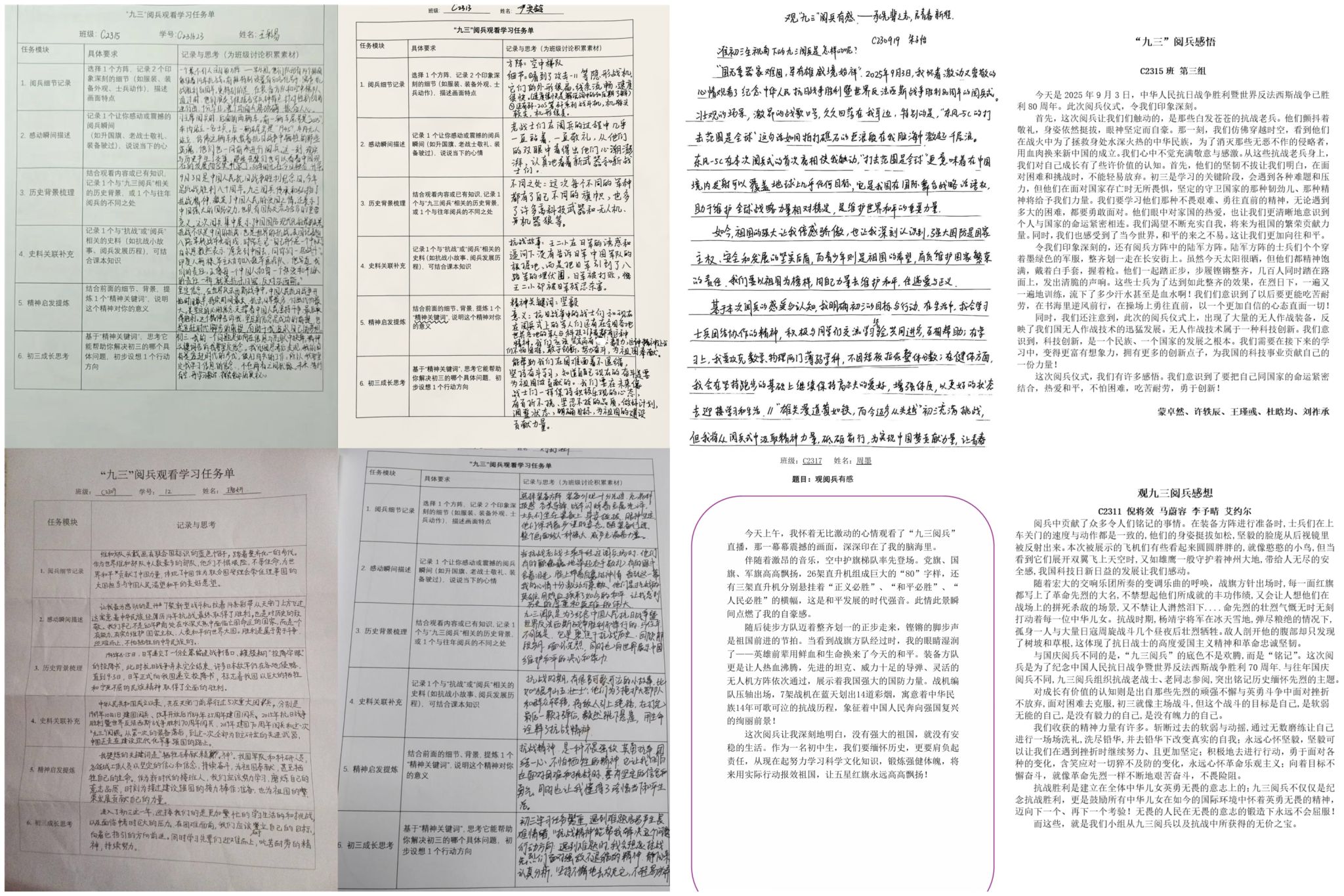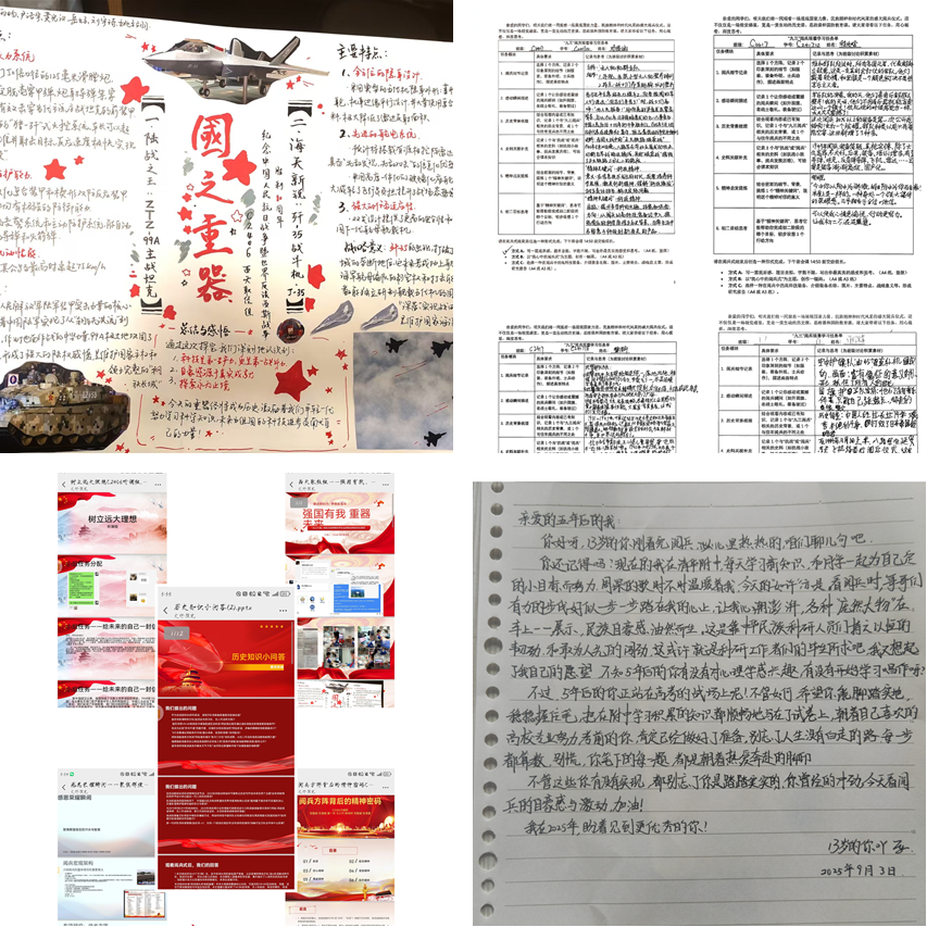 各班以小组为单位,开展分享交流活动和探究性学习,内容包括解读“国之重器”的科技内涵、梳理阅兵历史变迁、分析方阵背后的精神密码等;通过手抄报、研究报告、知识竞赛、诗歌创作等多种形式展示学习成果。同学们积极参与互动问答、观后感分享、时空对话等活动,在交流中深化了对抗战精神与时代使命的理解。