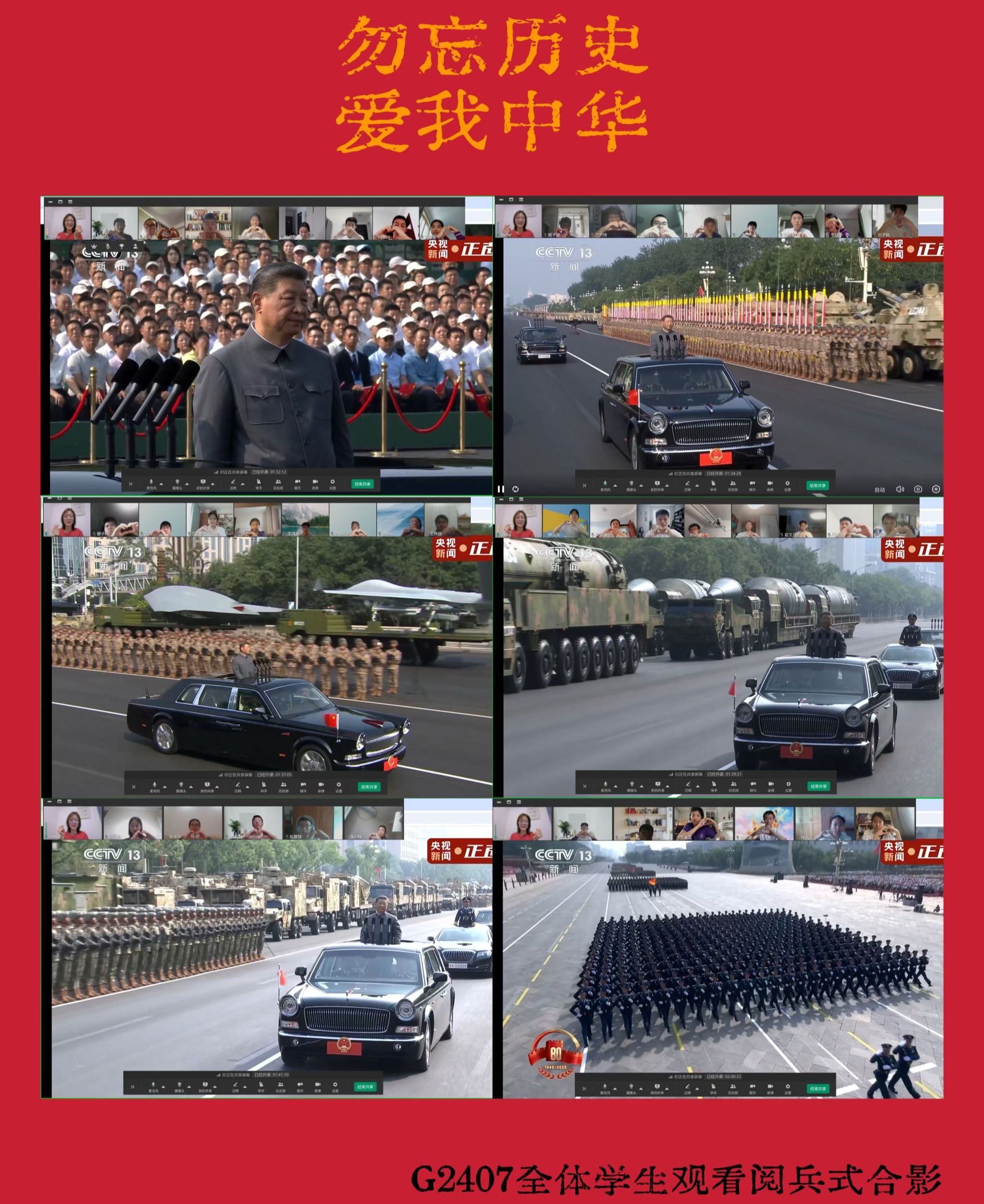 抗战精神薪火相传,吾辈青年砥砺奋进。9月3日上午,高24学部全体师生相聚云端,共同观看纪念中国人民抗日战争暨世界反法西斯战争胜利80周年阅兵仪式直播。新型武器装备划破苍穹,受阅方阵步伐铿锵有力,高24学部师生眼中闪烁着自豪与敬仰的光芒,拳拳爱国情在心中激荡。