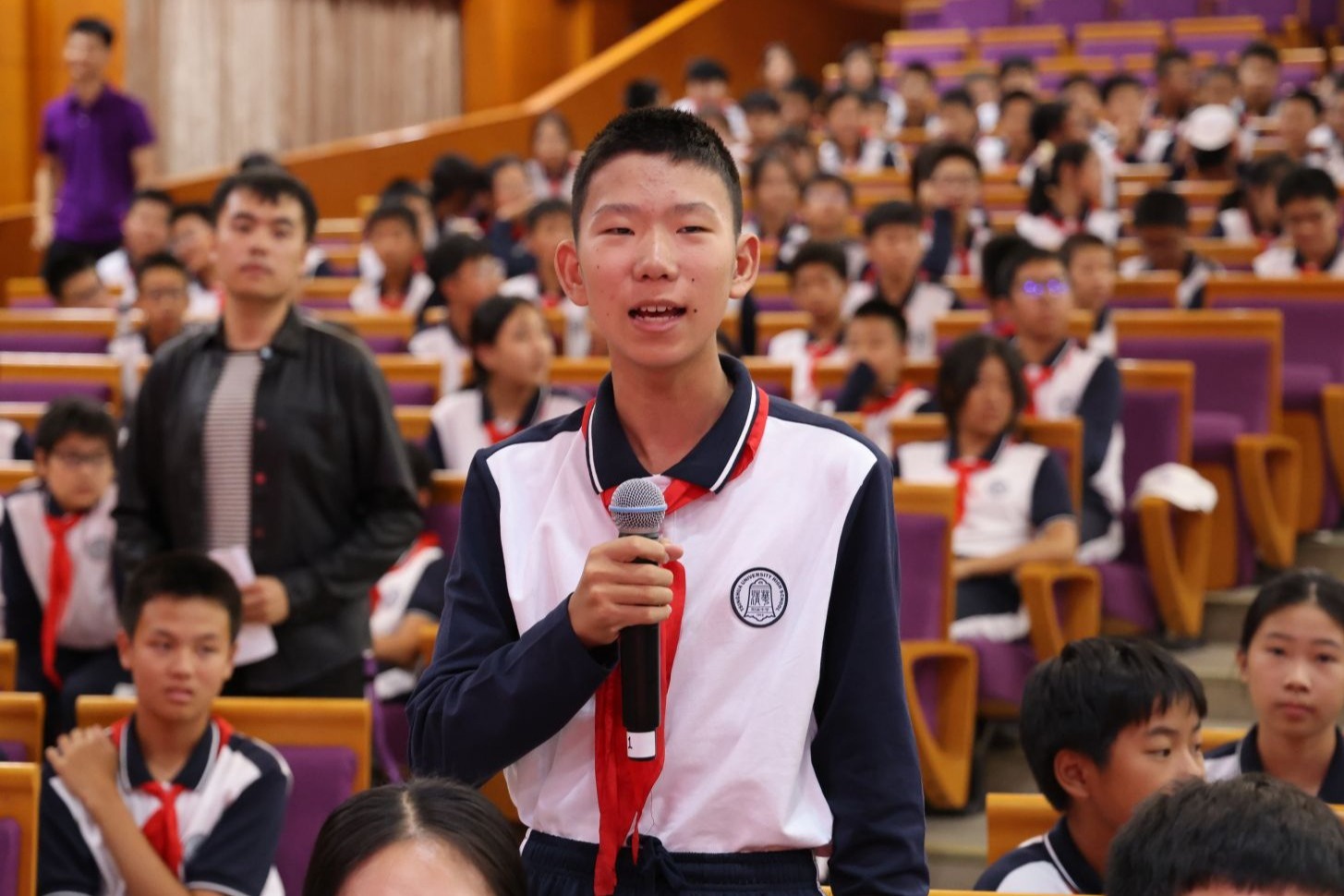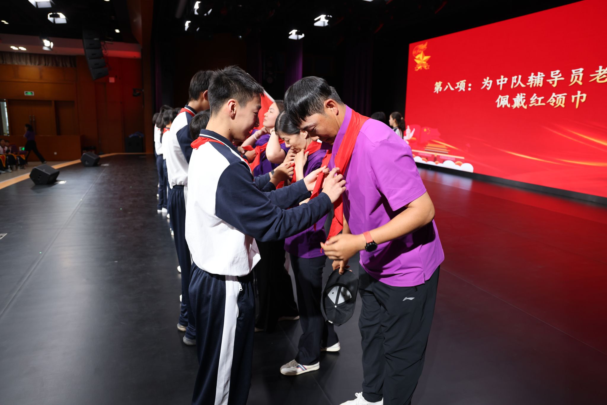 为感恩师长引领,组织委员们为各中队辅导员佩戴红领巾,鲜红的领巾在师生间架起责任与传承的桥梁。随后,全体少先队员面向队旗,举起右拳庄严宣誓,铿锵的誓言回荡在校园中,成为少年们对信仰的郑重承诺。仪式中,学部还对入学教育阶段表现突出的班级进行表彰,初25学部副主任王敏与刘志杰老师为荣获“规范认知之星”的班级代表颁奖,激励全体同学严守校规校纪,筑牢成长根基。