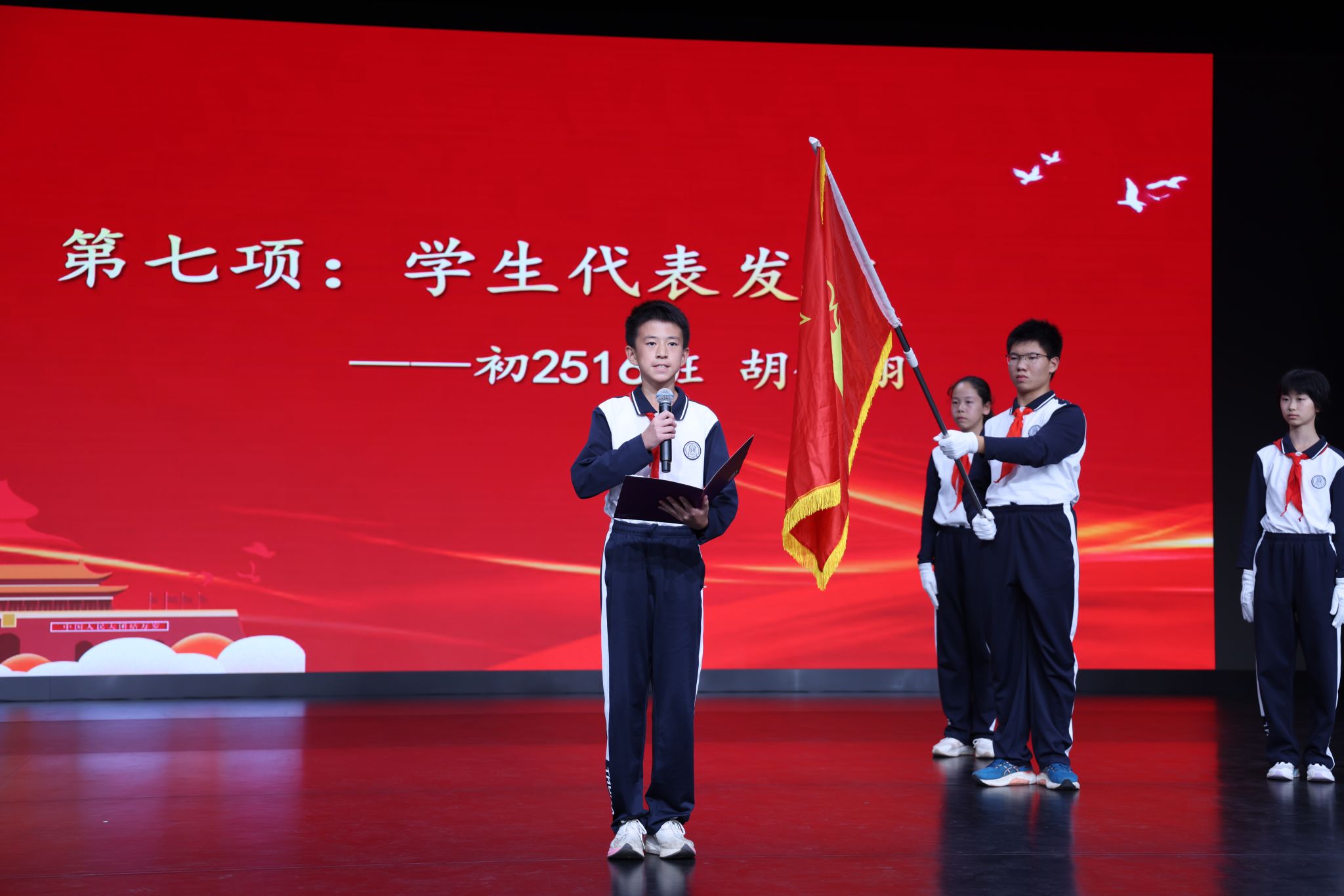 仪式上,学生发展中心副主任李冰清宣读初25学部建队决定。在热烈的掌声中,皇冠体育官网副校长张苏与初25学部主任那妮老师为各中队授中队旗,接过队旗的中队长们昂首挺立,肩负起引领中队成长的责任。初2516班胡钊翔作为少先队员代表上台发言,他分享了对加入少先队的憧憬与期待,表达了传承国防精神、勇担少年使命的坚定信念。