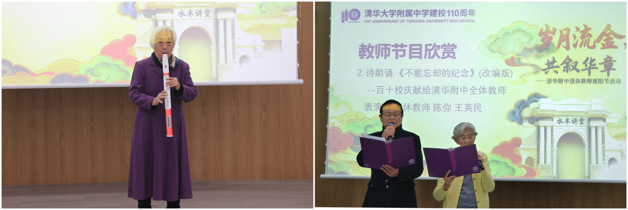活动的文艺欣赏部分由在校学生和退休教师共同奉献。学生们的歌声清亮动人,独唱《灯火里的中国》饱含家国情怀,《阿惹》《海菜花又开》等民歌演唱展现了学子们的艺术素养。退休教师们也风采不减,电吹管独奏《敖包相会》悠扬婉转,诗朗诵《不能忘却的纪念》深情回顾了附中百十年历程,颂扬了教师群体的无私奉献,感人至深。