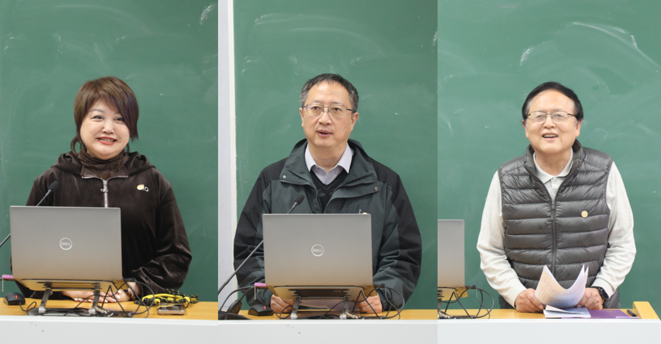 左起:艺术办公室主任鞠红、语文教研组长邹明、校友会副秘书长王英民三位教师进行交流发言