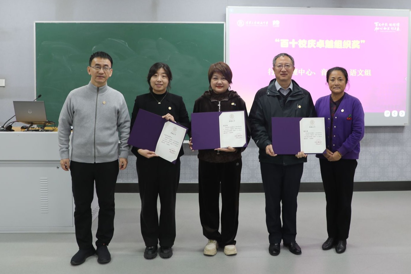 左起:曹海翔、行政管理中心代表杨瑞、音乐组代表鞠红、语文组代表邹明、方妍