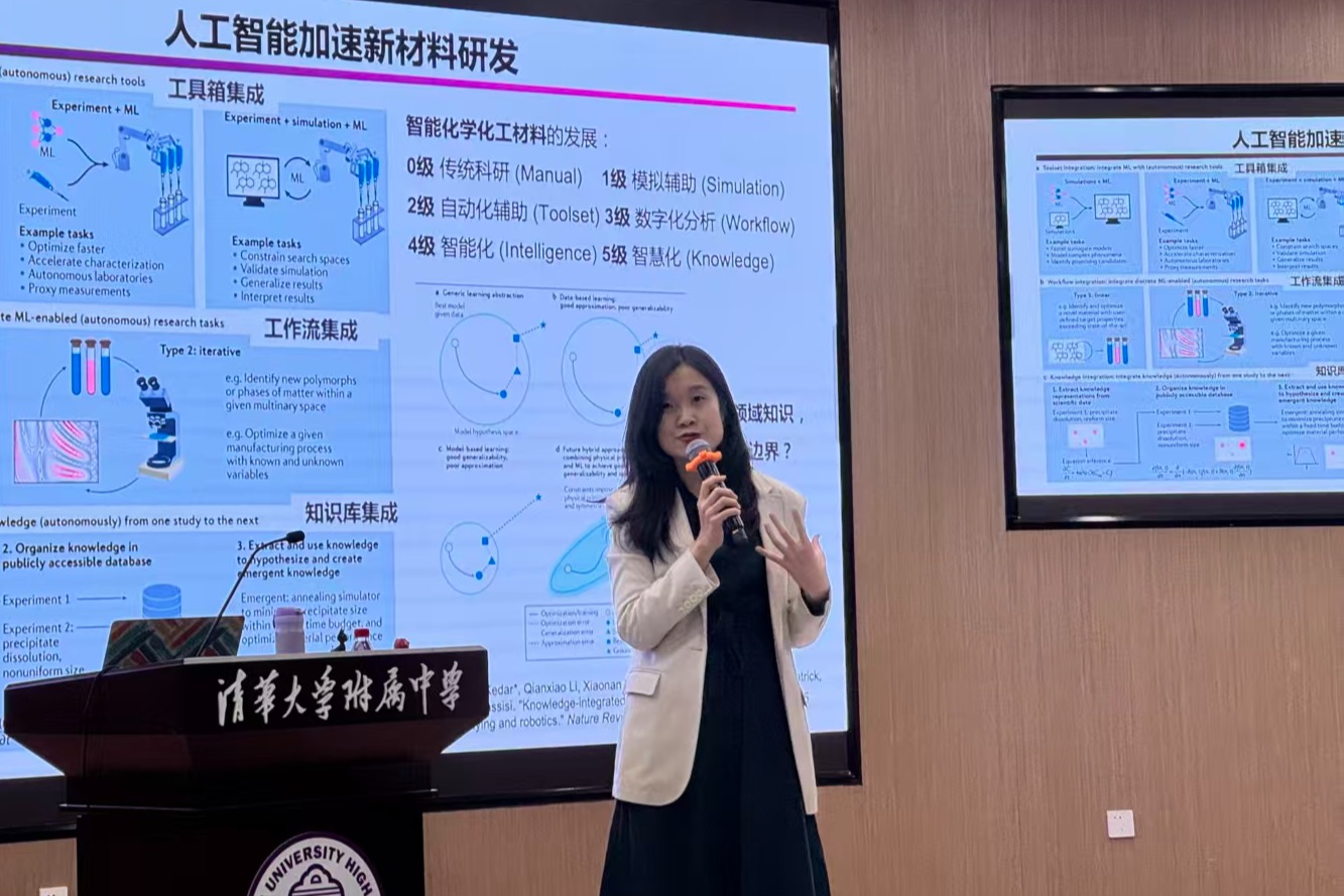 11月12日下午,清华大学化学工程系长聘副教授王笑楠老师受邀走进校园,为初23学部创新书院学生带来了一场题为《大模型时代的AI赋能化学化工新材料设计与智造》的精彩讲座。本次活动由初23学部创新书院化学备课组与学生发展中心生涯办公室联合组织,旨在拓宽学生科学视野,激发跨学科创新思维,助力生涯规划启蒙。