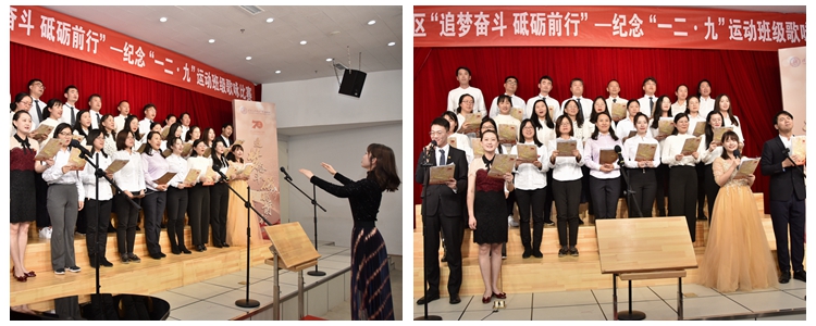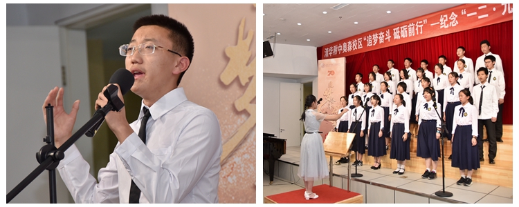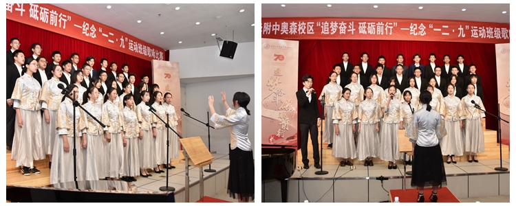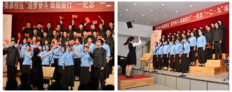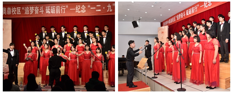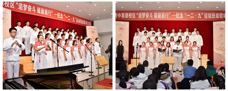 为庆祝新中国成立70周年、纪念“一二·九”运动84周年,本次活动以“追梦奋斗 砥砺前行”为主题,采用班级歌咏比赛的形式。奥森校区高一、高二年级的同学们怀揣着中华儿女炽热的爱国情怀,通过朗诵与演唱革命爱国歌曲,抒发对祖国的祝福,唱响对国家的热爱。