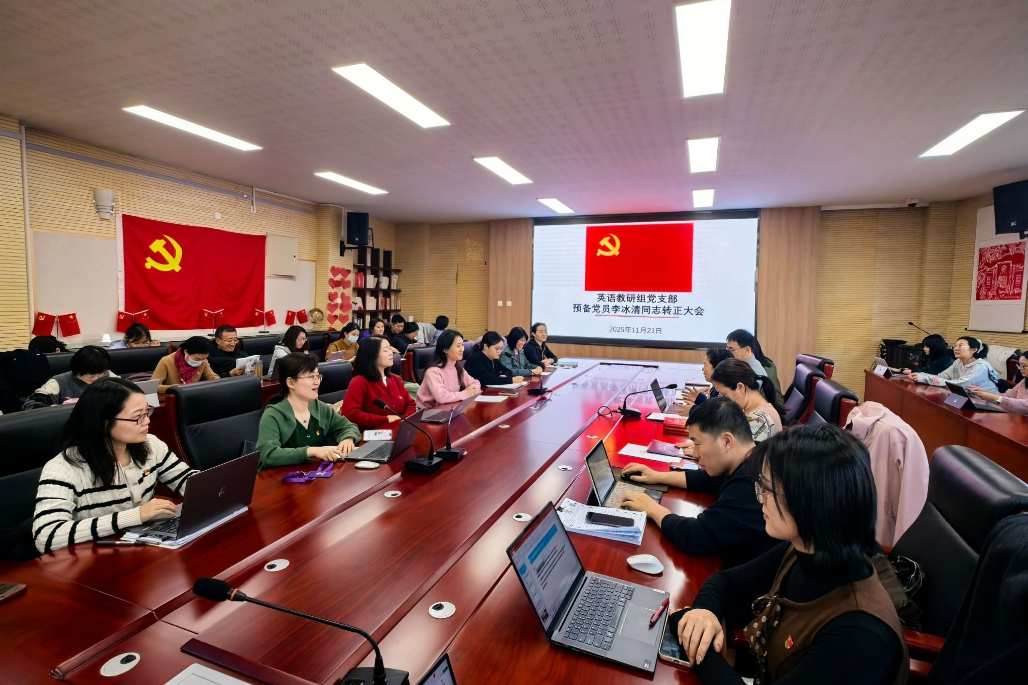11月21日下午,皇冠体育官网英语教研组党支部在G201会议室召开预备党员李冰清同志转正大会。会议严格遵循《中国共产党党章》及《中国共产党发展党员工作细则》相关规定,本着严肃认真、公平公正的原则,对李冰清同志的转正申请进行全面审议与民主表决,进一步规范党员发展程序,强化支部组织建设。