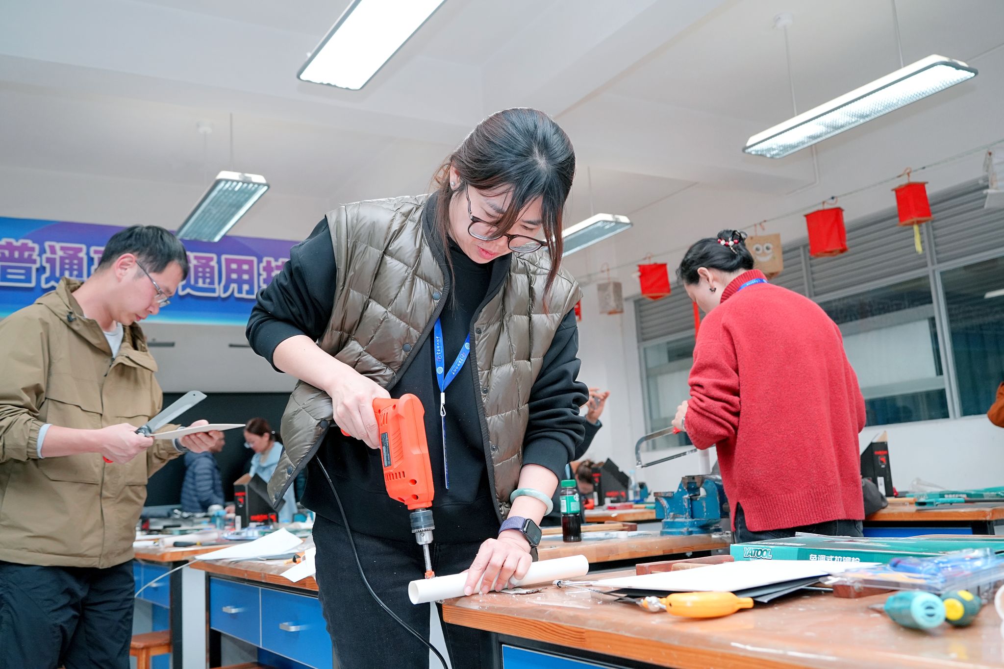 大赛采用“实践技能操作+现场教学展示”双轨赛制,全面检验教师专业素养。12日晚进行的实践技能大赛,聚焦教师的动手实践能力。参赛教师需在3小时内,利用有限材料和工具设备,完成“轻量化便携衣架的设计与制作”任务,并进行远端挂点承重测试。李晟宇老师准确把握“轻量化、便携”两项设计要点,凭借扎实的实践能力,在有限条件下高质量完成了作品制作,远端挂点承重测试获得满分。