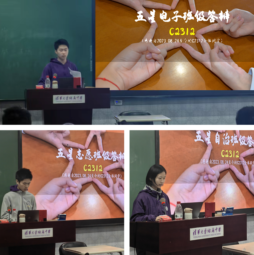 本次答辩聚焦初2312班五星级“学生自治星级班级”“志愿服务星级班级”“电子设备使用星级班级”三项荣誉的申报。答辩环节中,该班学生代表依次登台,系统呈现了过去两年半的班级建设成效。