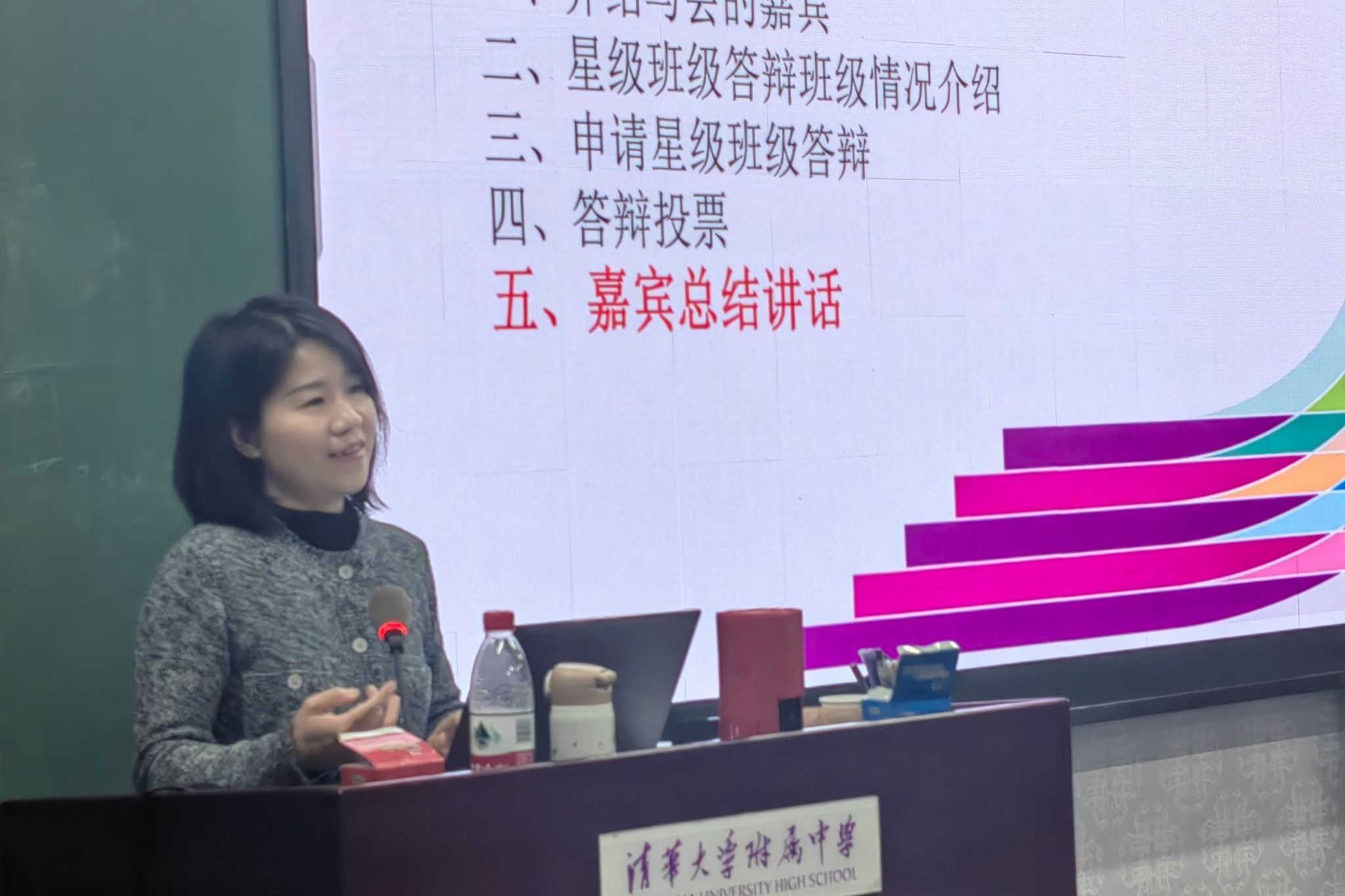 学生答辩结束后,初23级学部副主任周小玲老师发表讲话。她对初2312班全体同学及班主任的付出与成果给予高度肯定,鼓励学部其他班级见贤思齐,在个人自律、班级自治方面步履不停努力向前,并寄语即将告别义务教育学段、迈向人生新阶段的初23学部学子,在未来征程中需注重提前规划、扎实落实,稳步走好人生关键步伐。