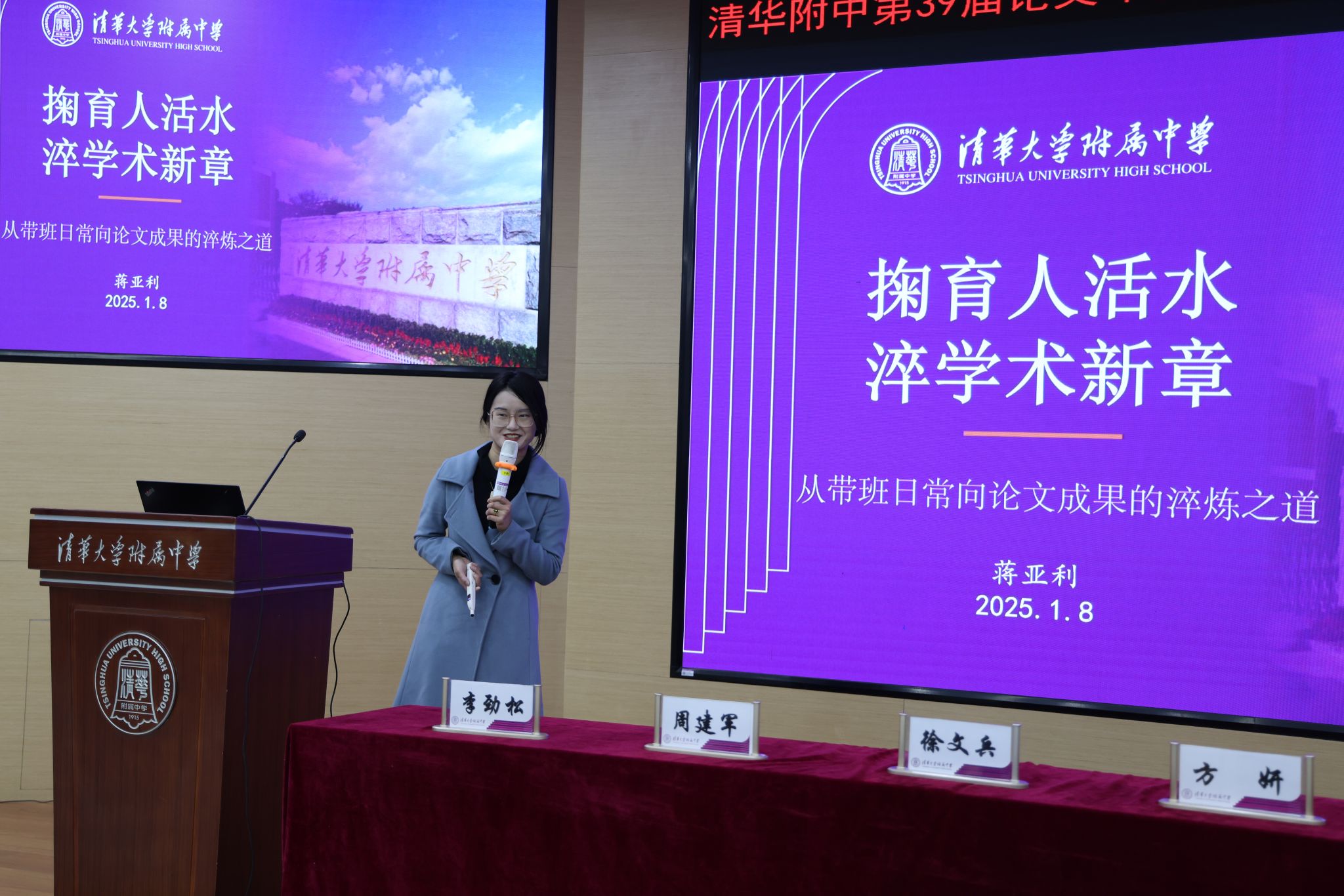 蒋亚利老师则以《掬育人活水 淬学术新章—从带班日常向论文成果的淬炼之道》分享了班主任工作的科研转化路径。她提出“困惑淬题、实践淬料、理论淬研、案例淬型”的四步方法,通过匿名编码、作业统计、行为规范量化等具体做法,构建了班级管理“硬规矩”与“软文化”并重的育人体系。她介绍,自己三年来累计向家长群发送700余张学生成长记录单,通过隐私保护与精准反馈的平衡,实现了家校共育的高效联动,而这些真实的实践素材最终沉淀为具有推广价值的学术成果。