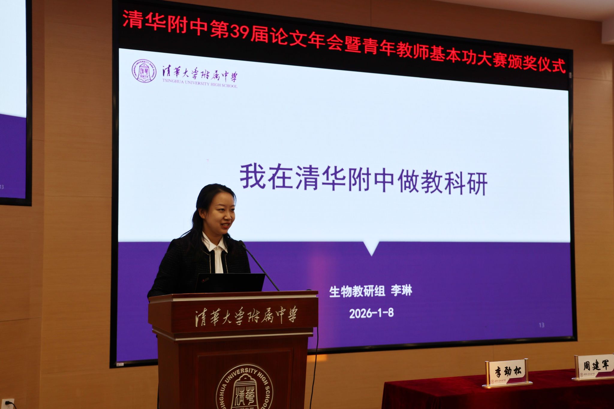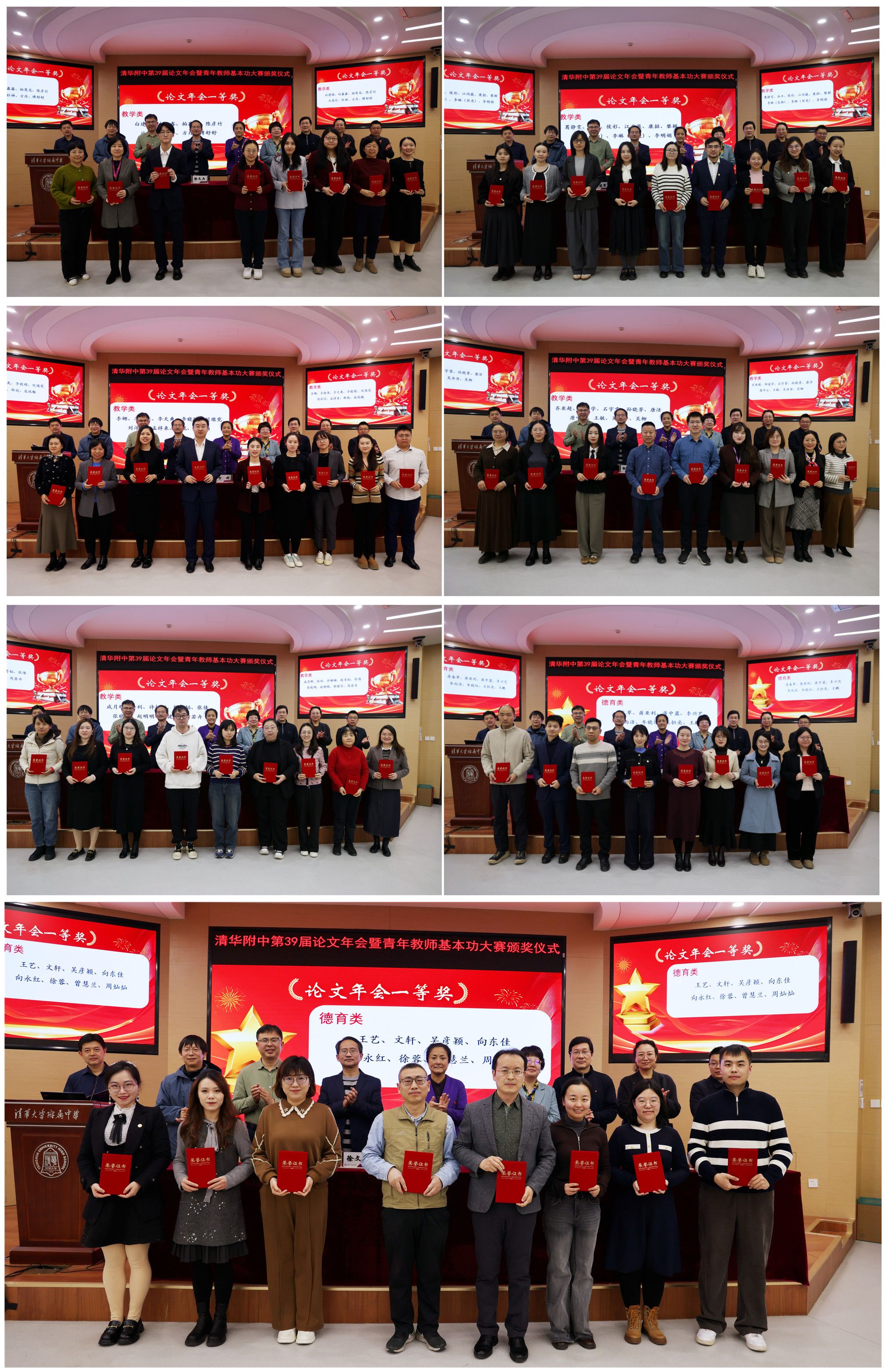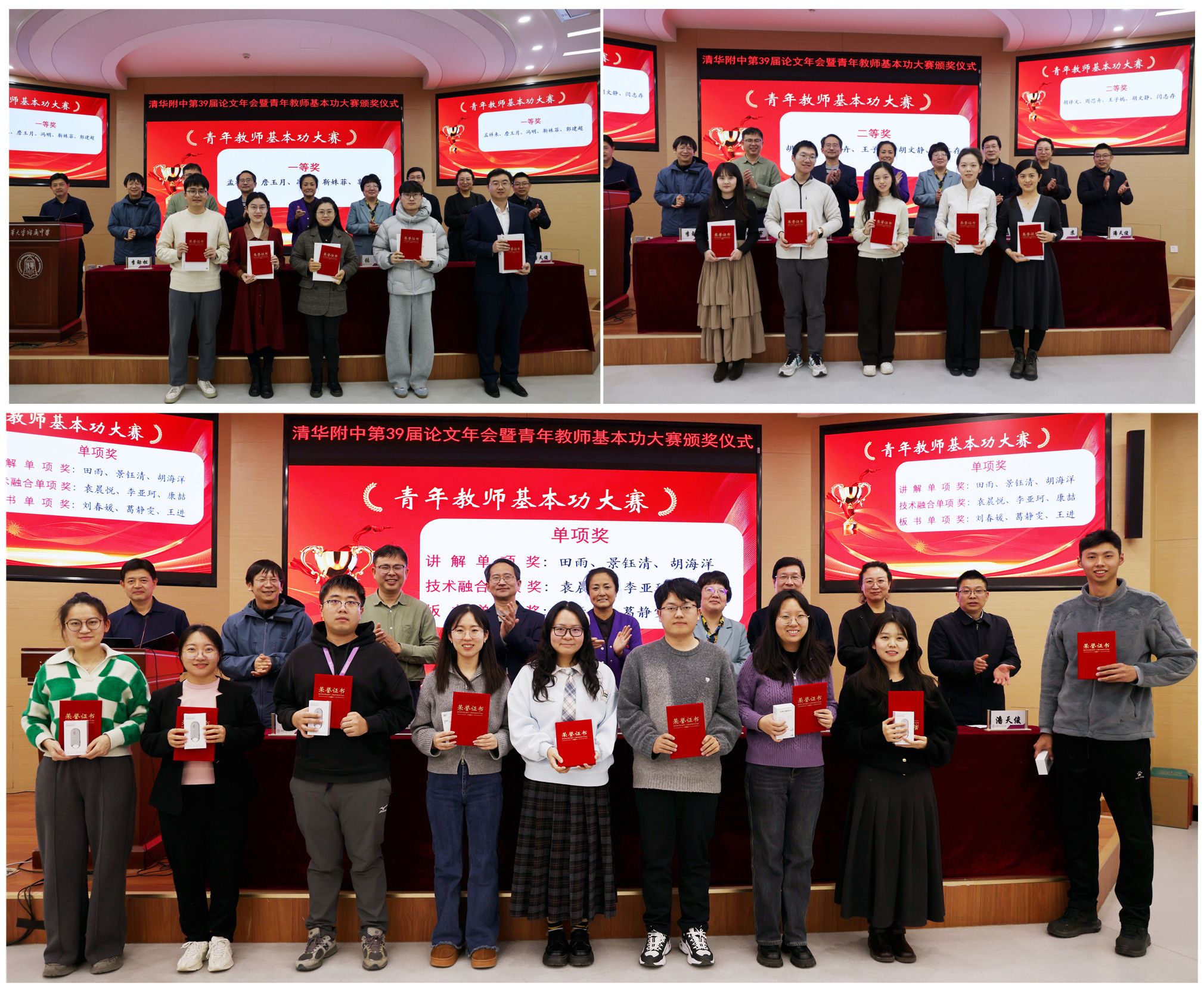 颁奖环节,方妍校长先后宣读了本次教科研论文年会及青年教师基本功大赛的表彰名单。语文教研组、英语教研组、生物教研组荣获“论文年会最佳组织奖”;64位教师撰写的作品分别获得教学类、德育类论文一等奖,226位教师的论文获得二等奖。19位教师分别获得青年教师基本功大赛的一二等奖及单项奖。随后,校领导为全体获奖教师颁发荣誉证书,颁奖环节在热烈的掌声中进行。