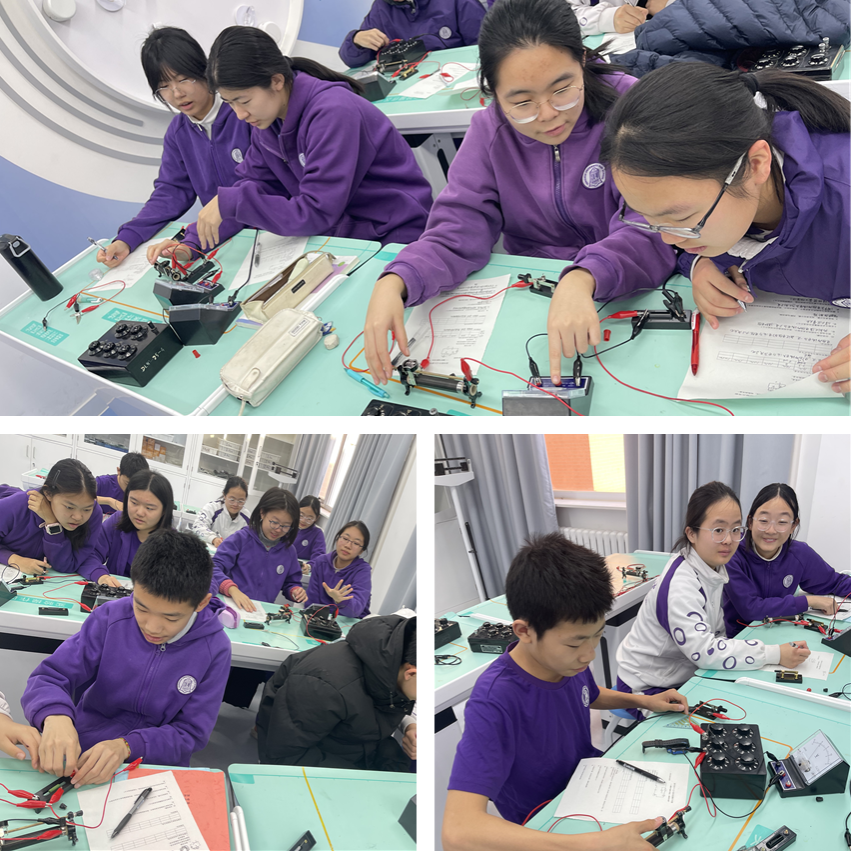 在物理实验室中,一部分学生们围绕“牛顿第二定律”展开探究实验。大家利用小车、打点计时器等器材,通过改变外力与质量,系统观察加速度的变化规律。实验过程中,同学们认真记录数据、分析误差来源,将课堂所学的物理定律与真实实验现象紧密结合,进一步加深了对力学规律的理解。另一部分学生展开了电学实验。他们专注地连接电路、调节电阻,细致观察电流表与电压表的每一次变化。在操作中,同学们不时交流现象、探讨原理,通过亲手实践真切感受到电学知识的生动与严谨。实验不仅锻炼了他们的动手能力和科学思维,也激发了进一步探索物理世界的热情。