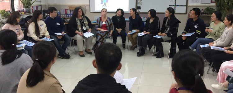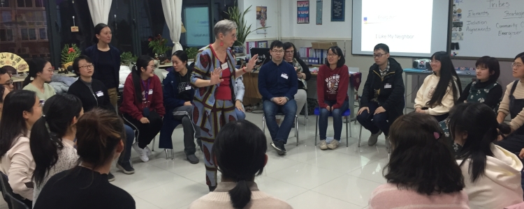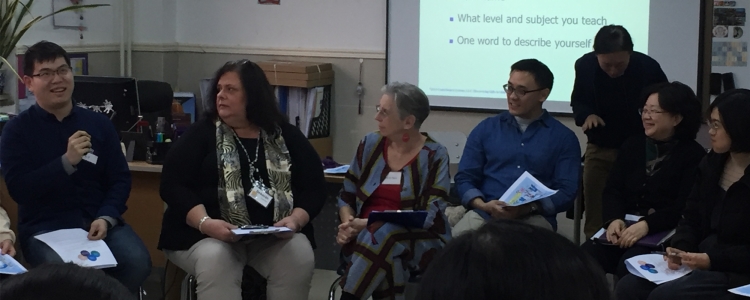 活动伊始,培训专家Lisa和Deborah老师请大家围坐成一个圈,每位老师用一个词来形容自己,增进彼此间的了解,然后自由找同伴互相介绍。老师们通过集体走动、坐椅子、发言等有趣的活动,活跃了现场气氛,人力资源中心主任刘贝贝、英语骨干教师周喆也参与其中。