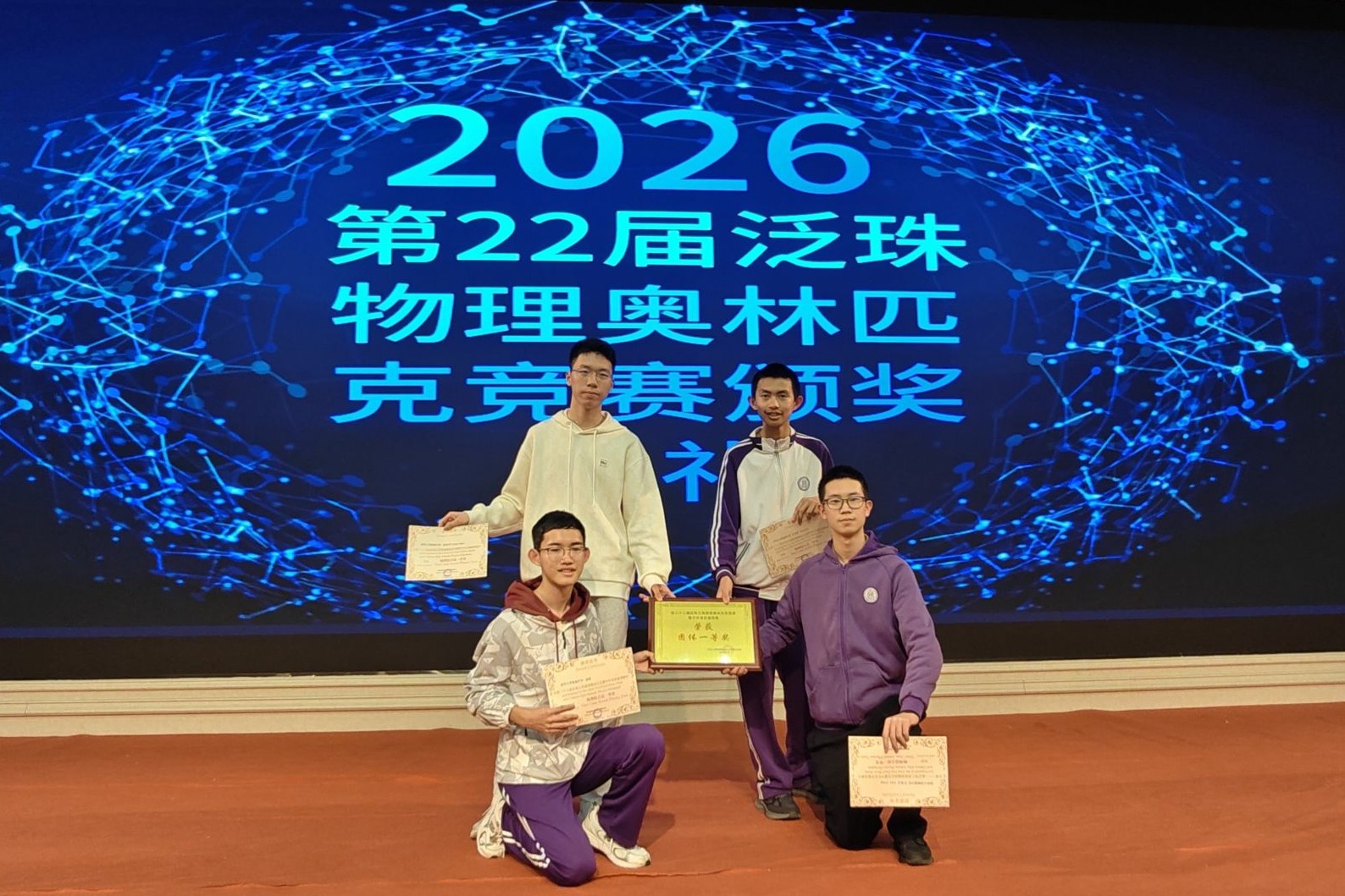 近日,2026年第22届泛珠三角物理奥林匹克竞赛暨中华名校邀请赛(简称“范赛”)圆满落幕。皇冠体育官网有3名高二同学和1名高一同学报名参加了赛事中难度最高的综合试比赛(涉及大学普通物理以及部分理论物理内容,并重视联系实际应用)。他们在和来自全国多所名校的400多名竞赛选手的角逐中取得了不俗的成绩。高二的吴宇辰同学跻身总分前十,并荣获一等金奖;高二的袁博和陈奕卓2位同学排名在前5%;高一的江希言同学排名在前10%。4位同学全部获得本届赛事一等奖,他们的指导老师分别是俞鹏老师和郭建超老师,两位老师也荣获本届赛事的优秀教练奖。