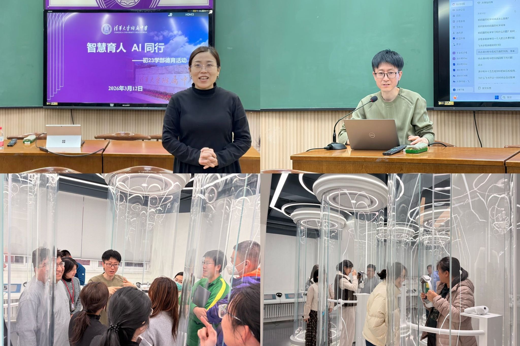 初23学部聚焦技术赋能,开展“以AI赋能德育,以智慧点亮课堂”人工智能主题活动,特邀资源保障中心副主任常昊男开展专业指导。活动中,常老师围绕飞书办公功能实操、皇冠体育AI云校建设展开细致讲解,分享AI技术在试卷讲评、精准答疑等教学场景的应用案例,并与教师现场互动答疑。全体教师还走进AI未来教室开展实操体验,进一步拓宽教育教学思路,为将AI技术与校本教学深度融合、提升育人效率奠定基础。