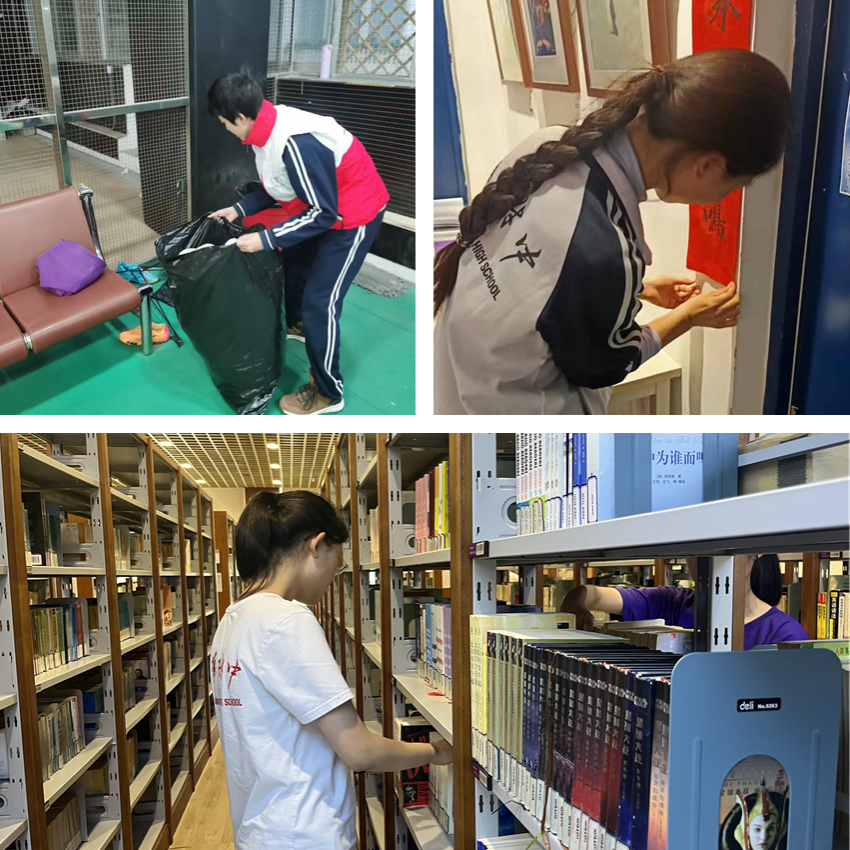水木行动打扫羽毛球馆、清理春联,高2304班整理图书馆书架
