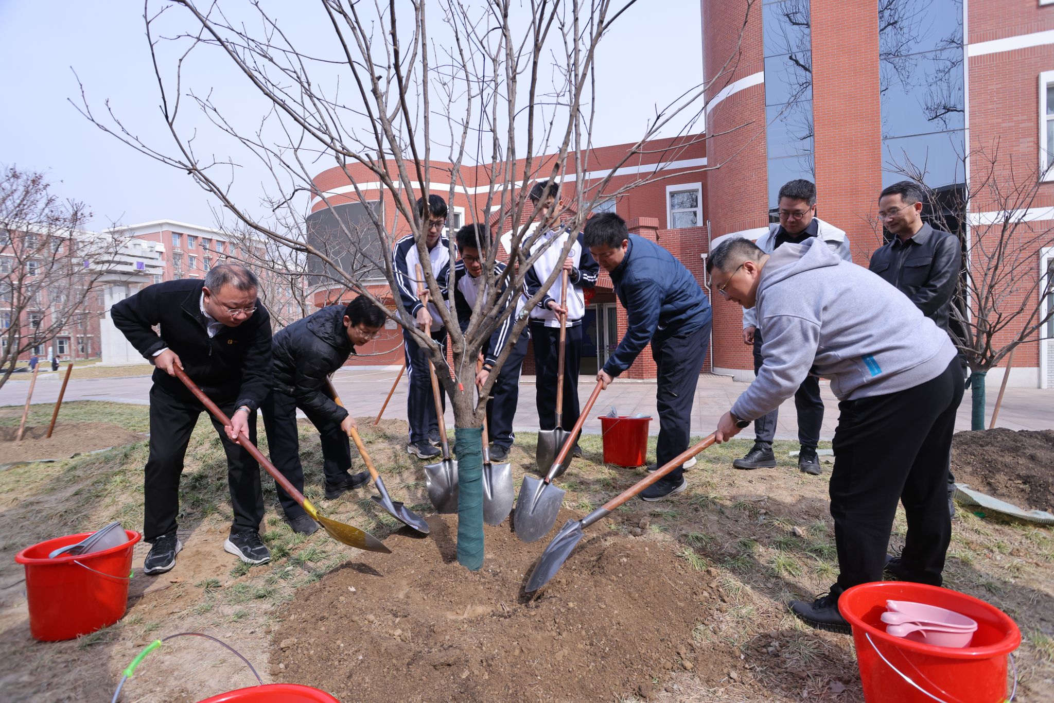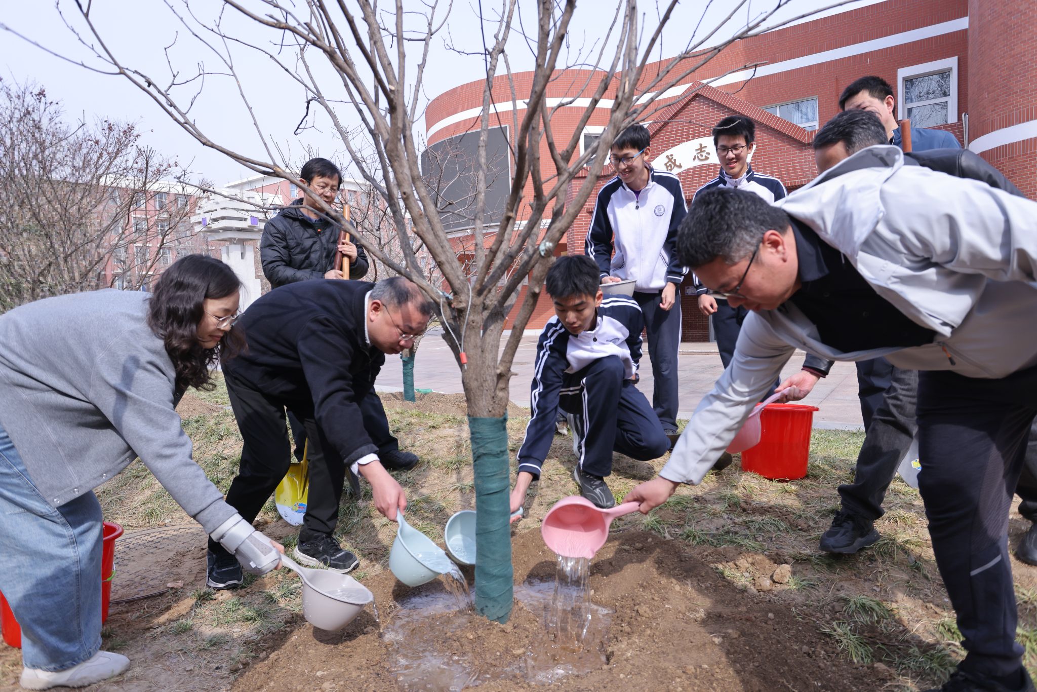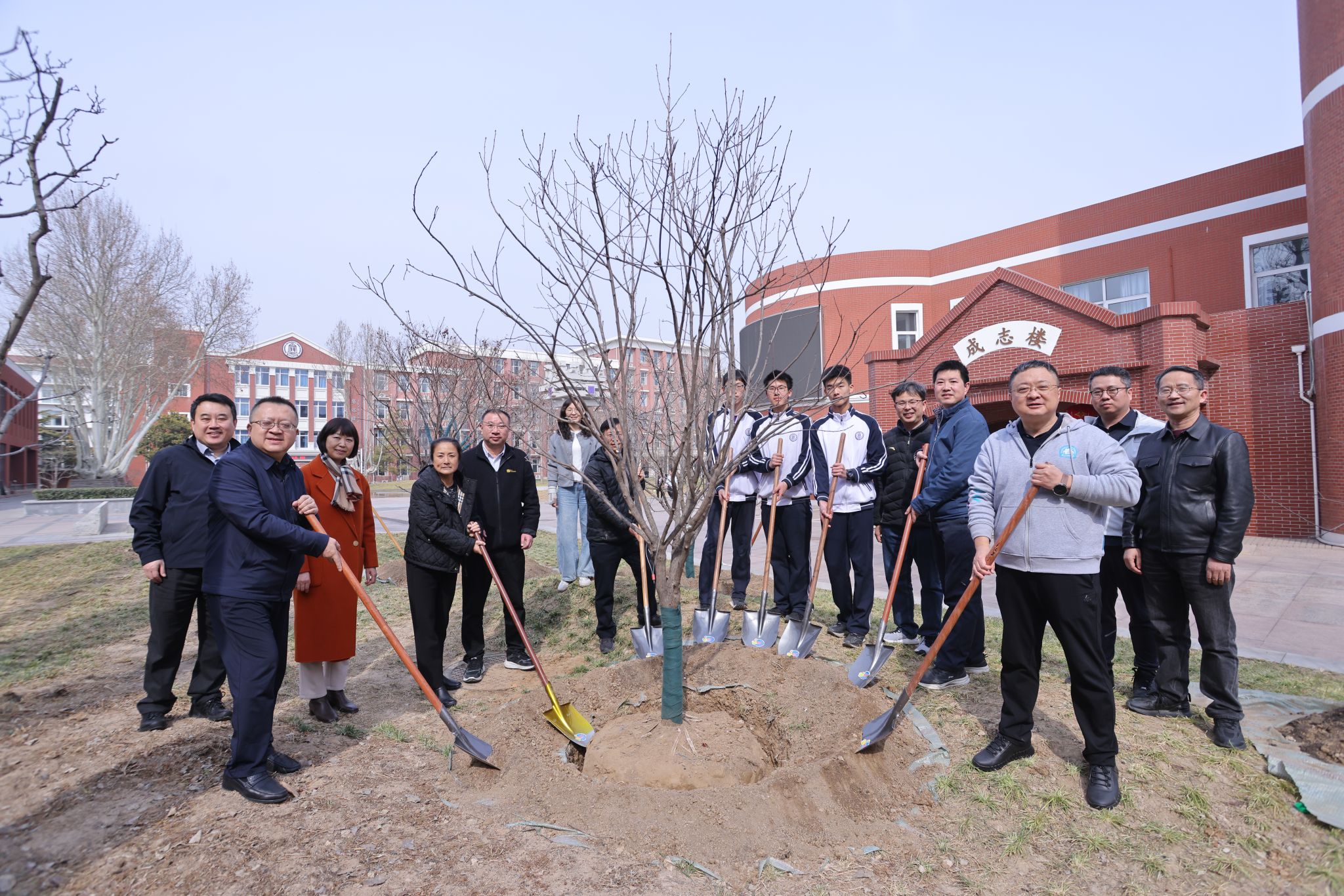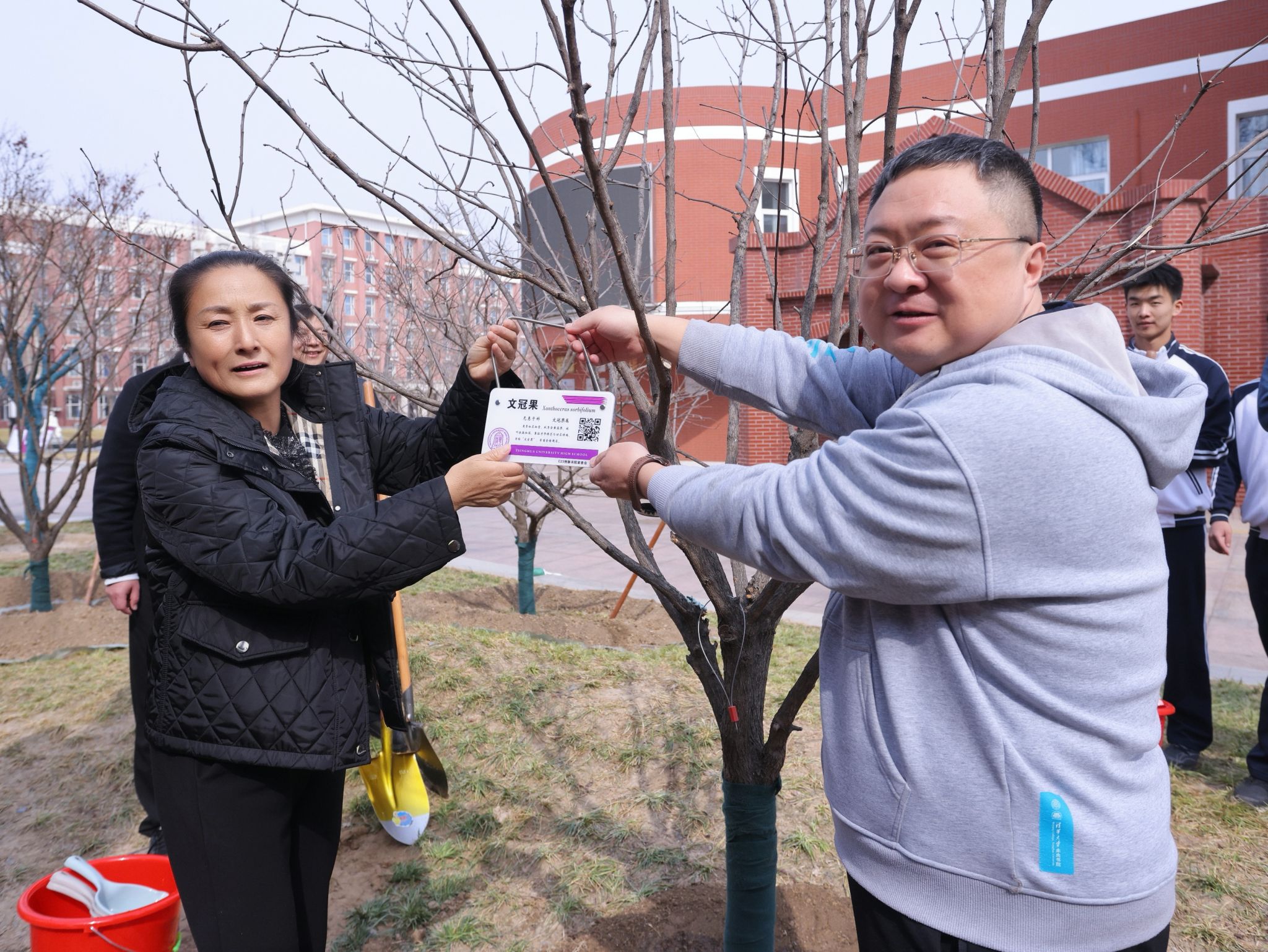 现场栽植的文冠树,由C23级创新书院家委会捐赠。校领导、嘉宾、家长代表与师生代表携手培土、浇水,共同为校园再添新绿。随后,方妍校长与家委会代表清华大学电机系主任助理胡伟教授共同为文冠树悬挂捐赠树牌,见证家校同心、共筑美好校园的温馨时刻。