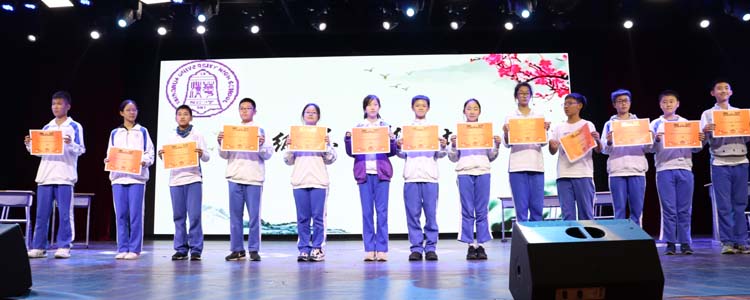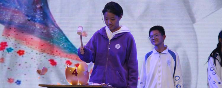第五项是同学们最期待的“诗词飞花令”活动,14位选手在台上各展其才,台下掌声不断。接着进行全年级第三次现场抽号。第六项是现场比赛颁奖环节,由语文组老师们分别为获奖者颁奖。最后全体同学起立,齐诵岳飞《满江红》,语调铿锵,气势磅礴,将全场氛围推向高潮。语文组老师们还为特等奖获得者精心策划了彩蛋环节,获奖者拥有“砸金蛋”的权利,并有机会获得语文组独家定制的精美奖品。