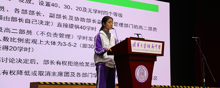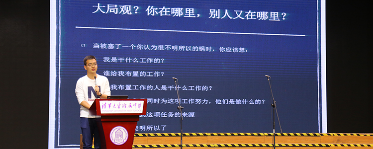 接着,第二十一届校团委副书记朱翊豪,现就读于清华大学新雅书院,作为优秀毕业学生干部进行了学生工作的经验分享。朱翊豪同学首先提出作为学生干部需要兼顾学习和工作,权衡好学生工作在高中生活中的位置,提高办事效率,保证充足睡眠。同时他提出,在学生工作和学习任务同时出现时,要有对学生工作的动力也要把握好学习任务的优先性。其次,朱翊豪同学分享了自己高中数学老师曾说的一句话,“打游戏最重要的两点是微操和大局观,做数学题和其他事情也一样”,由此引出了在学生工作中对微操和大局观的应用。他基于自己的个人经验,指出作为学生干部需要很熟悉自己手下的资源,做到精准操控。同时,需要对工作整体有一个大局观。最后,他提供了几点在工作中创新的方法和途径,希望新一届团委、学生会能够传承以往经验的同时,努力做到继往开来、发展创新。