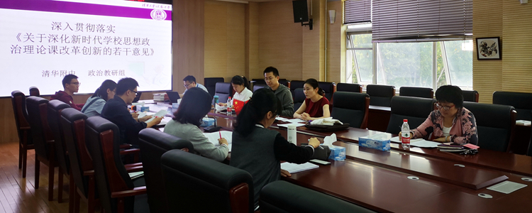 政治组全体成员首先集体学习了由中共中央办公厅、国务院办公厅印发的《关于深化新时代学校思想政治理论课改革创新的若干意见》。张洁副书记结合文件重点内容与重要精神,指出当前中学思政课堂承担着重要的育人任务,应紧扣时代脉搏不断深化改革创新,拓展思政课的建设格局,用习近平新时代中国特色社会主义思想铸魂育人。与会全体教师也纷纷结合自身学习感受与已有课堂实践,认真思考并热烈讨论了新形势、新任务、新挑战背景下如何进行改革创新以全面提高附中思政课质量和水平。