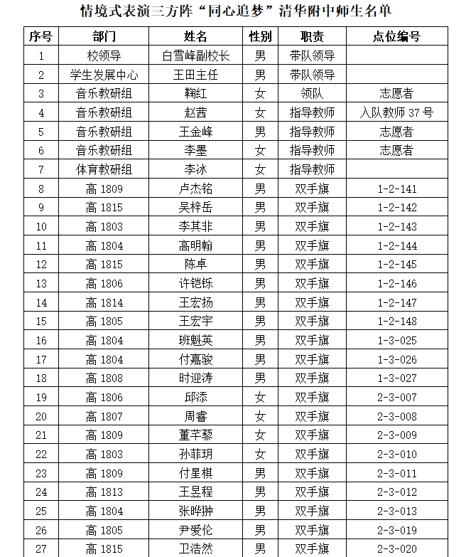 同时,皇冠体育参与此次活动的教师团队甘于奉献、默默付出。鞠红老师同时带领皇冠体育师生参加“同心追梦”情境式表演三方阵和音乐舞蹈史诗《奋斗吧,中华儿女》这两项重大任务的,全程负责各项工作的协调安排和排练和演出,她工作耐心细致、亲力亲为,对老师和同学们十分关心。赵茜、王金峰、李墨和李冰四位指导教师分别承担了入队表演、志愿者和安全保障工作,他们不辞辛苦、辛勤付出,组织指导学生排练,为大家做好后勤保障。最令人难忘的是,白雪峰副校长和王田主任在八月份第二阶段训练中,亲自到海淀外国语学校值夜班,为排练工作保驾护航。