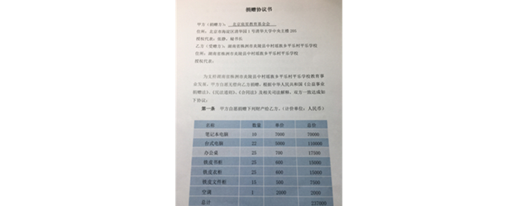 热心家长给瑶乡平乐学校捐了许多绘画工具、文件夹、文具等。初1808班家长还联系了北京宸星教育基金会,为瑶乡平乐学校捐赠了笔记本电脑、台式电脑、办公桌、空调、铁皮柜等价值共计237,000元,大大改善了瑶乡师生的学习生活条件。