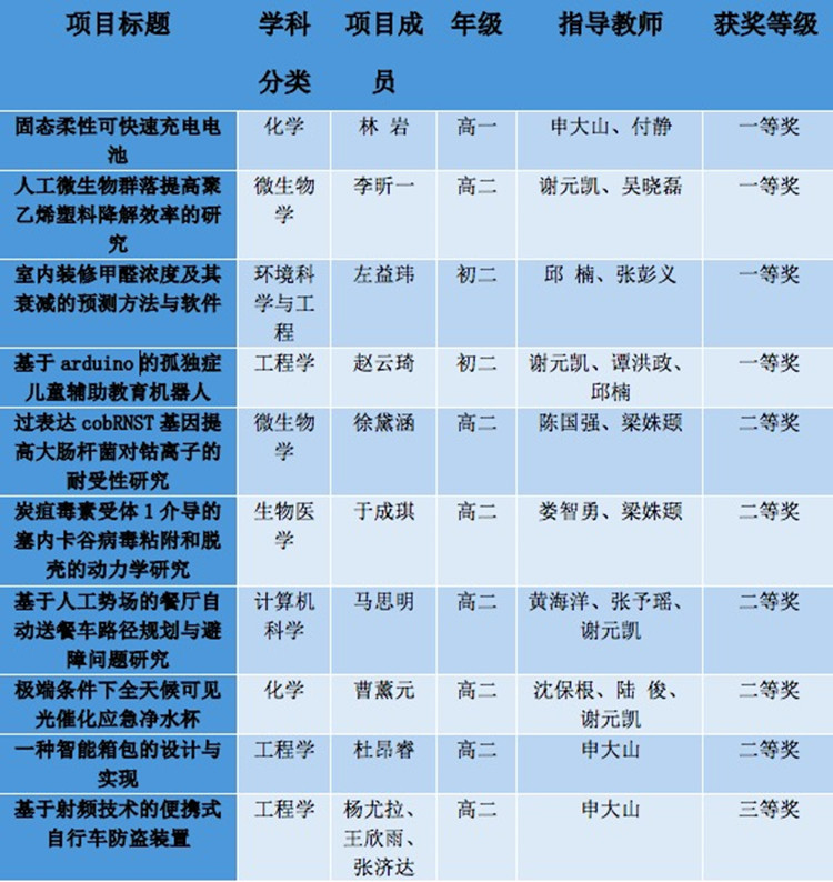 高1815班林岩、高1706班徐黛涵、高1713班李昕一、初1703班左益玮、初1708班赵云琦在科技办公室谢元凯老师的带领下赴现场参加了此次终评活动,取得了四个一等奖,一个二等奖的好成绩。
