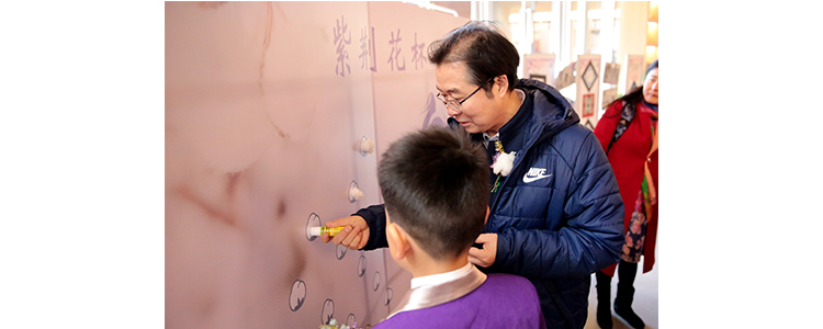 王殿军校长与小学生在签到板上共同“种”下棉花
