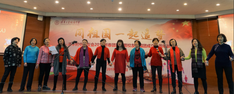 新年联欢会由校友陈耘、刘明明主持,田园艺术团首先为大家带来舞蹈《阿拉木汗》;校友郭东方演唱咏叹调《美好的夜晚多寂静》; 男声小合唱《等待出航》(领唱:王英民 朗诵:沈以力)《啊!朋友再见》(领唱:沈学锋);中国人民解放军陆军文工团于乃久演唱《最美的歌献给妈妈》、《我和我的祖国》;女生小合唱《又见炊烟》;王殿军校长演唱陕北民歌《东方红》;男女生小合唱《海港之夜》、《窗外有棵稠李树在摇晃》(钢琴伴奏:马迅);中国人民解放军陆军文工团贾珍演唱《节日欢歌》;歌伴舞《沂蒙颂》;女生小合唱《相亲相爱一家人》;大合唱《去一个美丽的地方》、《同一首歌》、《共和国之恋》(指挥:许愿、钢琴伴奏:郑惠玲)。校友们用优美的歌声和舞蹈一起喜迎新春,祝福2019!