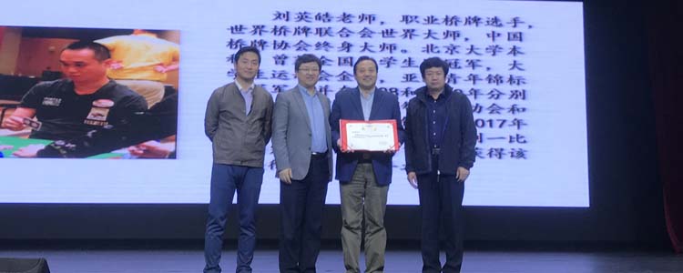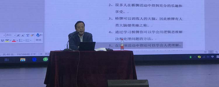 之后,刘虹老师为同学们做了主题报告,围绕桥牌的文化内涵、学打桥牌的好处、竞技桥牌以及简易桥牌的打法等方面全方位阐释了桥牌这一主题。