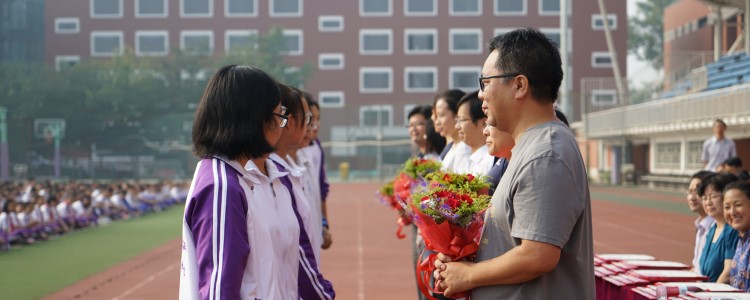 学生代表向教职工代表献花,表达对辛勤工作在学校各个岗位的教职工的感谢。