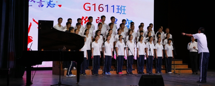 活动的后半段是“歌以言志”合唱比赛,艺术教育中心主任鞠红老师和音乐教研组王金峰老师、贺晓宇、高黄宝老师承担评委工作。各班赛前精心准备了班歌,既有发挥自己才智的独立创作,如高1614班的《梦想起航》、高1606班的《流景》、高1602班的《你的天空是否清朗》、高1609班的《玖歌》、高1605班的《如伍》、高1615班的《守望》等,也有对流行作品的灵活改编,如高1612班的《少年游》、高1607班的《倔强拼搏 知足常乐》、高1611班的《仰望星空》、高1613班的《this is me》、高1603班的《one day more》等、高1604班的《考后自救指南》、高1608班的《张士超你到底把我家钥匙放在哪里了》、高1610班的《waka waka》等,各班不仅歌声悠扬,更是在节目中融入了舞蹈、说唱、小提琴、贝斯、吉他、非洲鼓等多种表现形式,将现场气氛一次次推向高潮。
