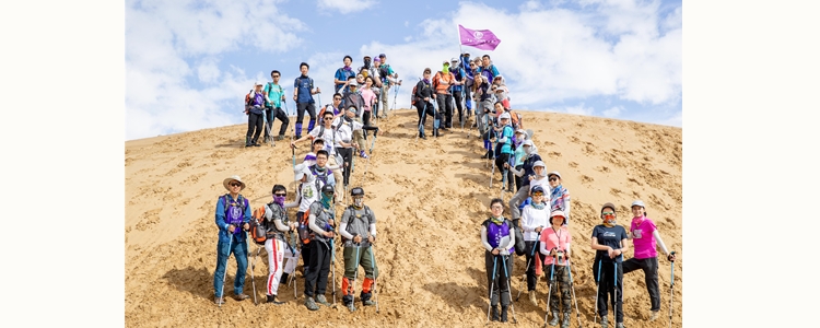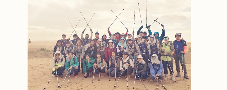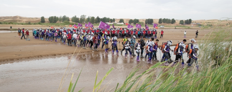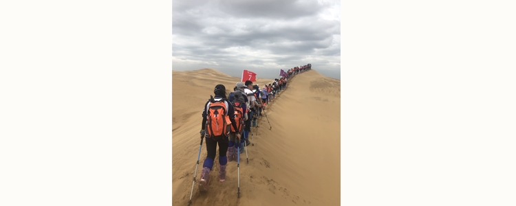 7月10日,同学们早早起床,快速的收拾好帐篷物资后,特意分组对营地进行地毯式搜索,将营地中所有的垃圾捡拾干净,做到了除了脚印什么也不留下。晴朗的天空不再有乌云,沙漠也展露出它狂躁的一面,上午同学们扛着烈日,手挽手肩并肩,趟过黄河支流,顶着大风,排成一字长龙,穿越沙山之脊,全体师生,无一人掉队,于中午抵达终点,携手撞线。