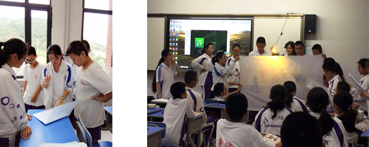 7月9日,学生们正式开始文安驿学校支教之旅。同学们准备的课程丰富多彩,引人入胜。语文一组以“陕西作家与文化”为主题,以贾平凹、陈忠实等作家为例,探讨了陕西本土文化与作家文学风格的关系;语文二组以儒家思想与道家思想的辩证关系为主题,引导学生辩论与思考。数学一组通过海盗分金币问题学习简化问题的思想,数学二组主要讲解形独的知识。英语一组利用动画短片引出How to write an interesting story的主题,给同学们上了一堂生动的英语作文课;英语二组以中外学校差别为主题,对比了国内外学校在教学内容、教学方法、学习方式、作业内容、时间分配、食物和运动等方面的区别。政治组通过皮影戏和华阴老腔等特色民俗文化讲解了文化传承的重要性。历史组围绕“五胡十六国的民族融合”、“淝水之战”、“北魏文帝改革”和“民族交流的利弊”等内容,以辩论赛的形式开展课程。地理一组以荒野求生为主题,让学生们讨论如何在黄土高原上野外生存,还设计了让学生们动手用牙签、皮筋和橡皮泥搭建野外庇护所的小组活动。地理二组以“治理北京的城市病”为主题,通过小组讨论的形式让同学们提出解决人均水资源短缺和治理空气污染的办法,将地理问题与实际生活相结合。生物组主要讲解蒸腾作用与气泡细胞观察。音乐组介绍了电影《音乐之声》并教唱插曲。体育组开设了室内和室外课程:室外课以篮球和足球学习为主;室内课则以体育知识问答的形式进行。美术组主要讲解了构图的重要性,并向学生们展示了大家创作的作品。同学们开设的课程受到了全体师生的高度好评,课后大家也积极分享了上课经验。