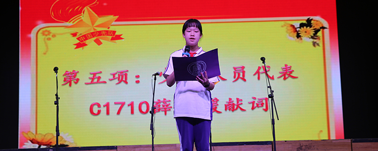 初1710中队薛媛媛同学作为优秀少先队员代表献词,她在献词中回顾了一年来的学校生活,道出了成功不仅需要迎难而上的勇气,更需要持之以恒的坚持和超越自我的决心的切身感受,同时对辛勤付出的各位老师表达了诚挚的谢意。初17级年级组长张晓明老师在大会上进行了热情洋溢的致辞,她在致辞中将初17级学生成长的点滴娓娓道来,用幽默的笔触和充满爱的话语道出了学校和学生的变化,给予学生温暖和鼓励,在致辞过后,张晓明老师为大家带来了初17级露营视频,全场气氛再次被点燃。