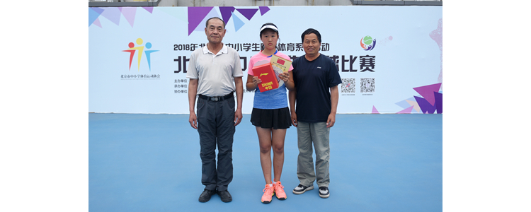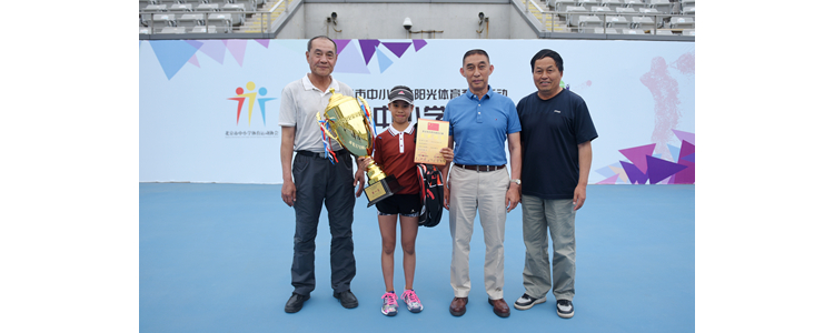 北京市中小学体育运动协会会长王时(右2)、秘书长张建中(左1)、竞赛部部长王克海(右1)为初中女子组冠军颁奖