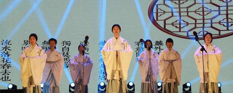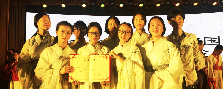 西园诗社成员身着素色曲裾,在灯光下款款前行,伴随着动人乐曲,吟唱了“千古词帝”李煜的名篇《浪淘沙令·帘外雨潺潺》,获得了北师大文学院颁发的“最佳风采奖”,收获了观众的赞许,感受了成功的喜悦。