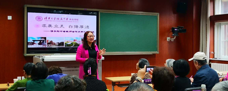 离退休党员抵达丰台学校后,首先参观了学生课间操跳绳活动,“绳舞飞扬”的场景给大家留下了深刻的印象。随后丰台学校执行校长陈红在立美楼给老师们做报告,全面介绍学校的历史背景、课程特色、发展规划以及文化建设。陈红校长在报告中深情回忆了她和在座老教师们当年并肩工作积极学习的场景。清华精神薪火相传,老教师们深受感染。