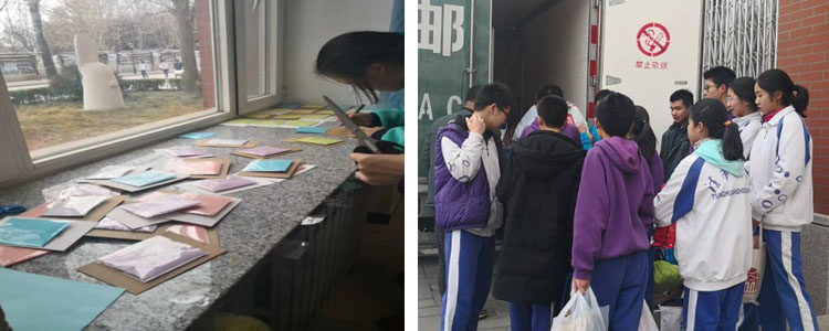 初1603班40位同学纷纷慷慨捐款,年级组长赵岩、班主任孙晓芳、生物老师苏韩霞、政治老师黎颖、历史老师王静和段维维也都自愿加入捐款队伍。金额不多,情意浓浓。收到捐款后,家委会积极寻找社会资源,用筹集到的有限款项,超值购买了47个梅花牌书包、47个保温杯、47张爱心联谊卡、文具一批,并发动学生捐出看过的旧书数百本,洗干净的旧衣物数百件等。同学们亲手在联谊卡上写下了许多真诚的话语,为远在祖国另一端的同学们送去祝福,更是对边疆贫困学子的精神鼓励。