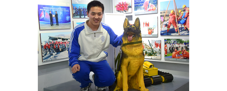 学生与“英雄”搜救犬合影