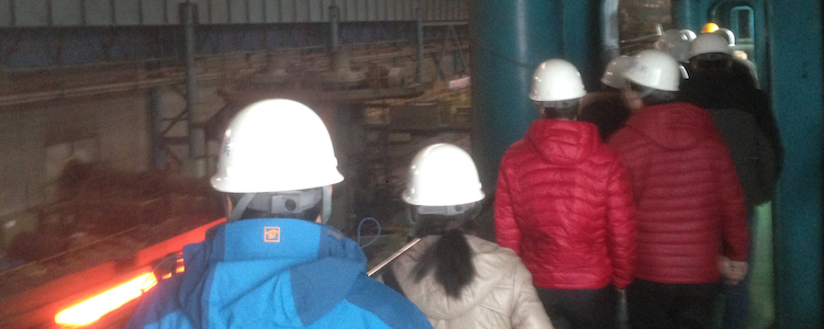 随后,大家戴上安全帽,深入热轧板生产线亲历热轧钢卷的诞生过程。红热的钢坯在加热后经过几道轧制、除鳞和切边后成为带有余温的钢卷,并由机械手打上特色代码,场面十分壮观和震撼!现场并没有看到工人,一切由中控室进行远程调控,这种大规模和现代化的合金生产技术给大家留下了深刻的影响。