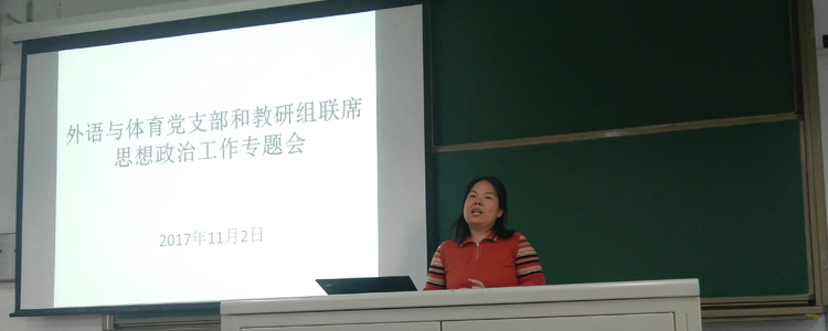 2017年11月2日下午,皇冠体育外语与体育党支部和教研组在B202召开思想政治工作联席会。此次专题会由外语与体育教研组联合党支部书记、英语教研组组长黄丽梅主持,英语学科和体育学科共60余名教师参会。