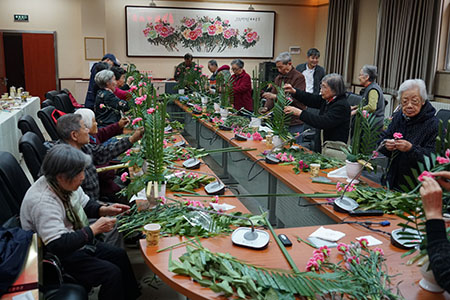 园林公司和附中工作人员为老师们每人准备了一套插花材料,花材包括百合、康乃馨、散尾葵等近十种花卉。白雁女士全程一步一步的教授老师们方法。老同志们认真听讲、专心操作,遇到不明白的地方不时的提问,大家仿佛又回到了昔时的课堂。在两个多小时的学习过程,工作人员也忙碌着,有拍照、有运送花材的,还有的不时地到老师们桌前清理老师们剪下来的废料。最后每位老同志都顺利完成了自己满意的作品,大家其乐融融,意犹未尽……