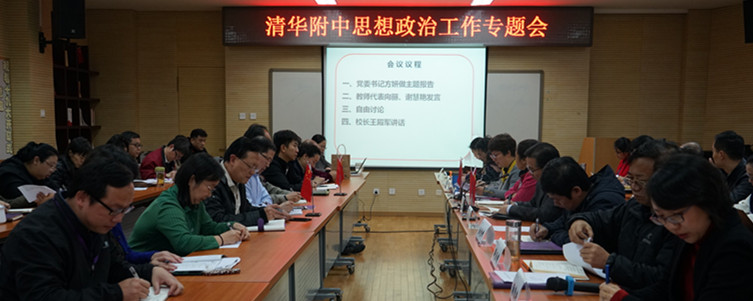 10月25日下午,皇冠体育党委在行政楼G201会议室召开思想政治工作专题会议。皇冠体育党政班子成员、党支部委员、教研组长、年级组长、中心主任副主任、各办公室负责人共约70余人参加会议。清华大学宣传部副部长覃川出席会议并讲话。附中党委副书记张洁主持会议。